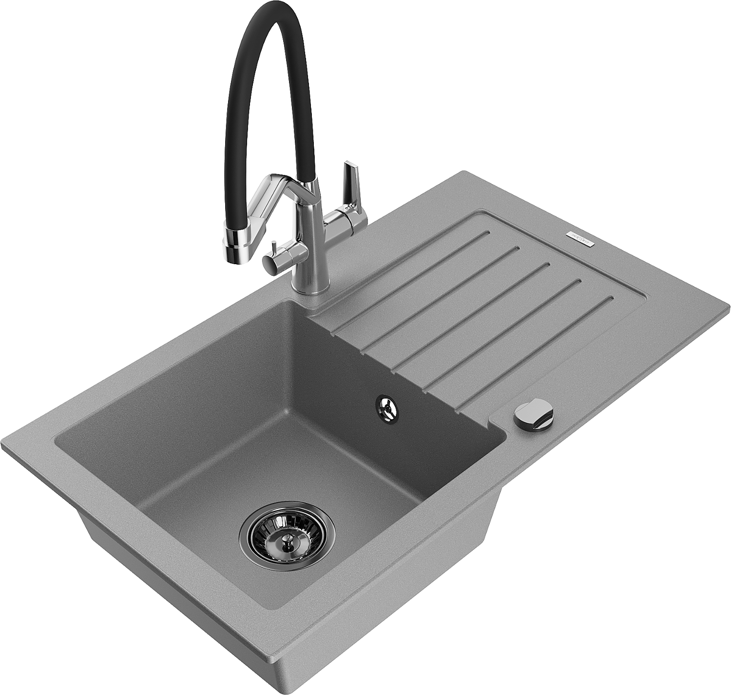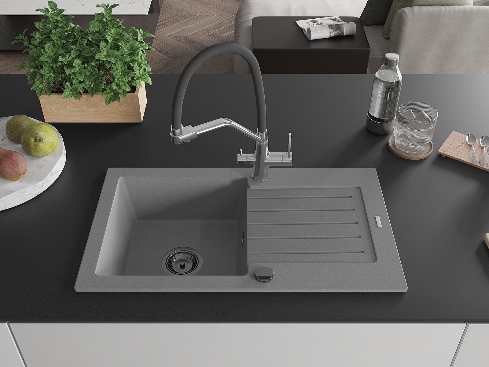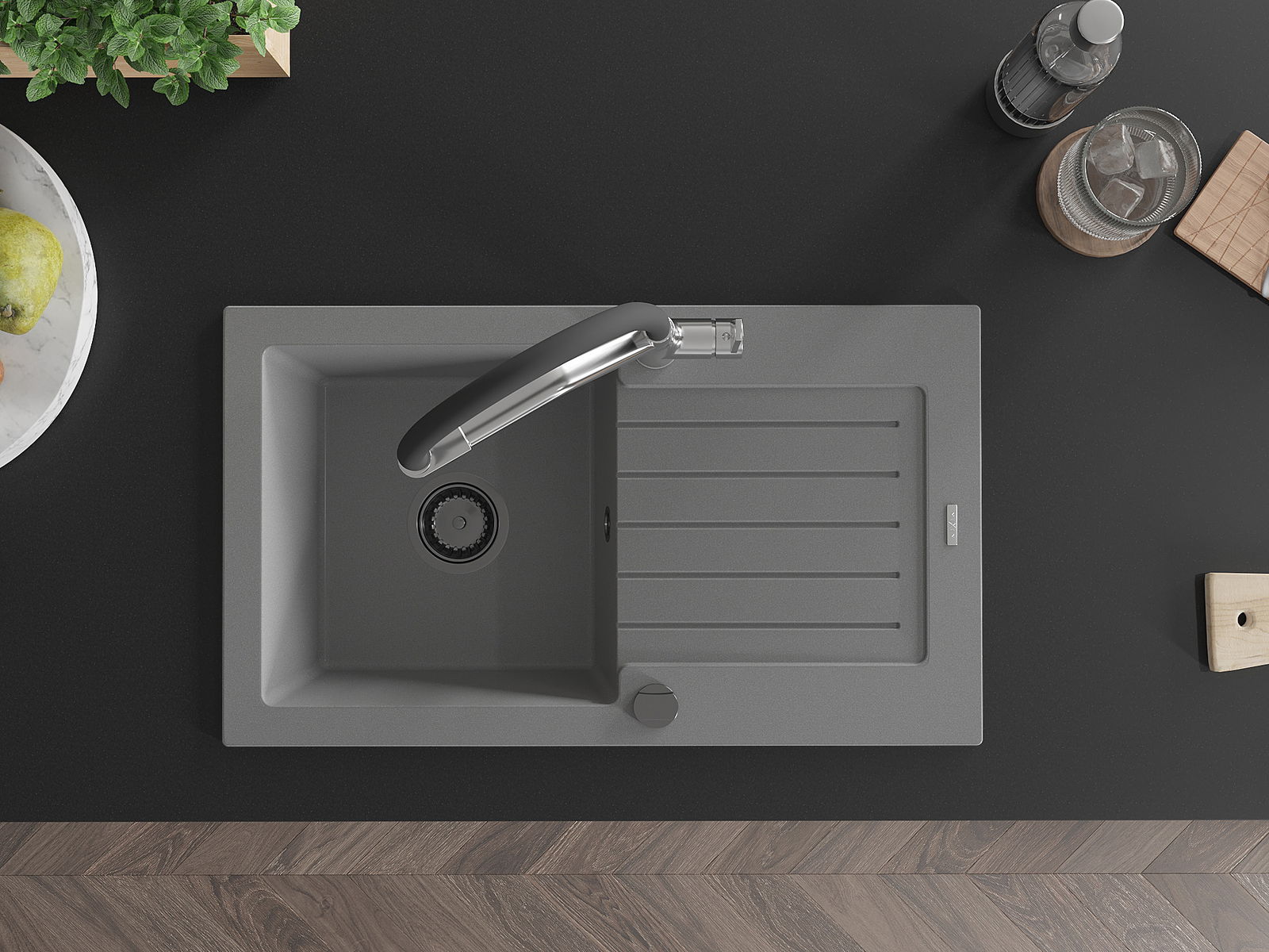 Mexen Pablo гранитна кухненска мивка с една камера с оттичаща повърхност и кухненски смесител Duo, сив - 6510-71-671701-07-B