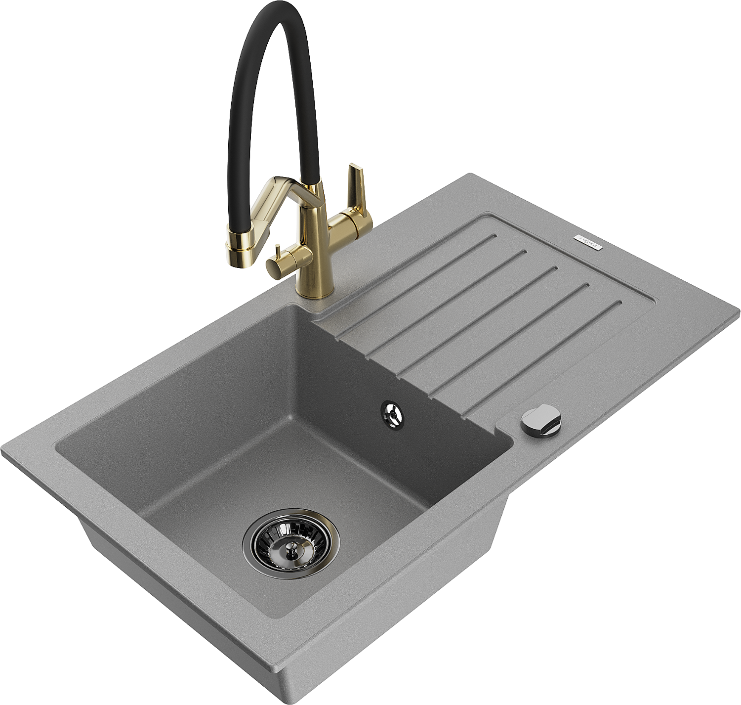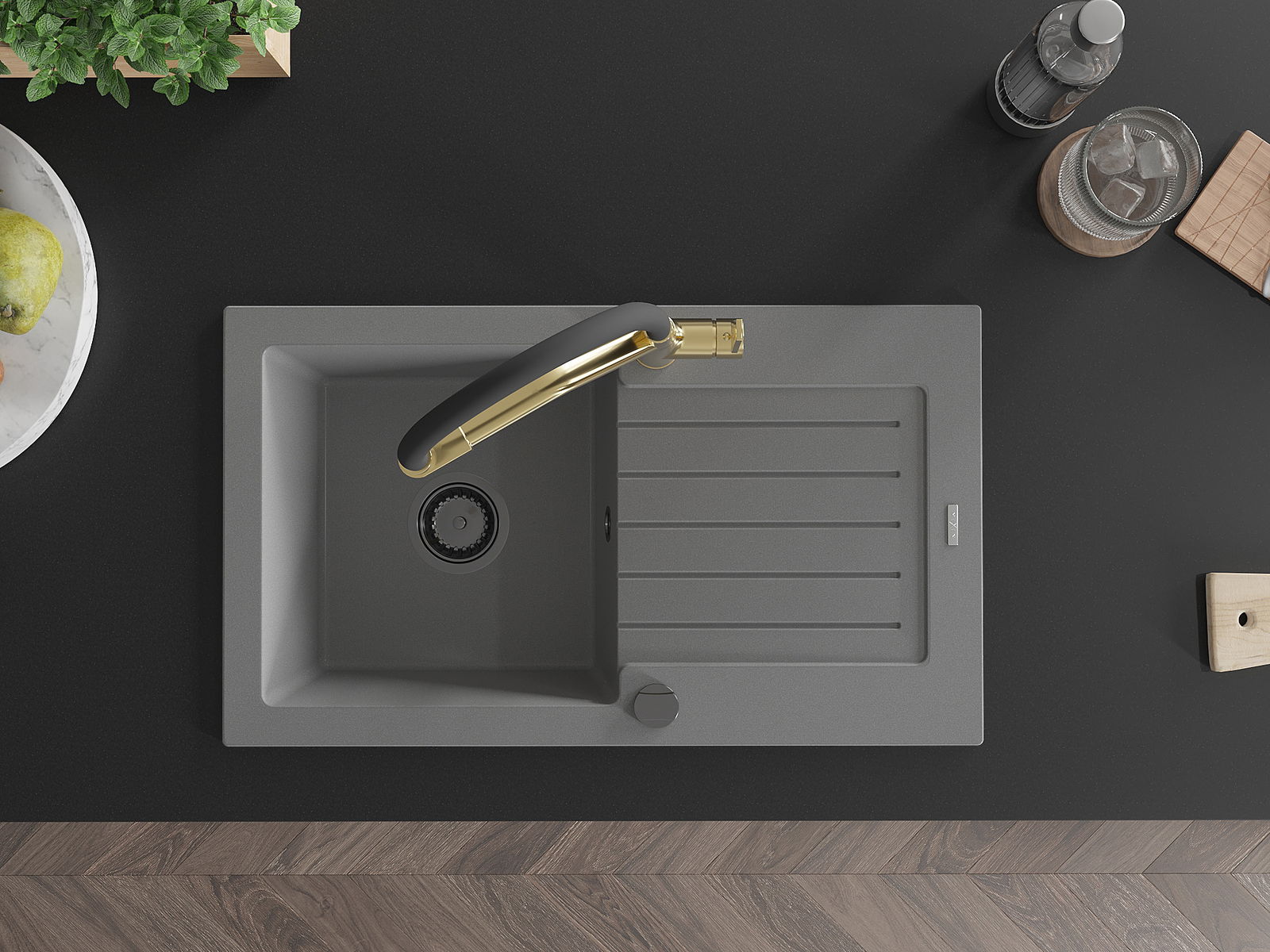 Mexen Pablo гранитна кухненска мивка с 1 корито, с отцедник и кухненски смесител Duo, сив - 6510-71-671701-57-B