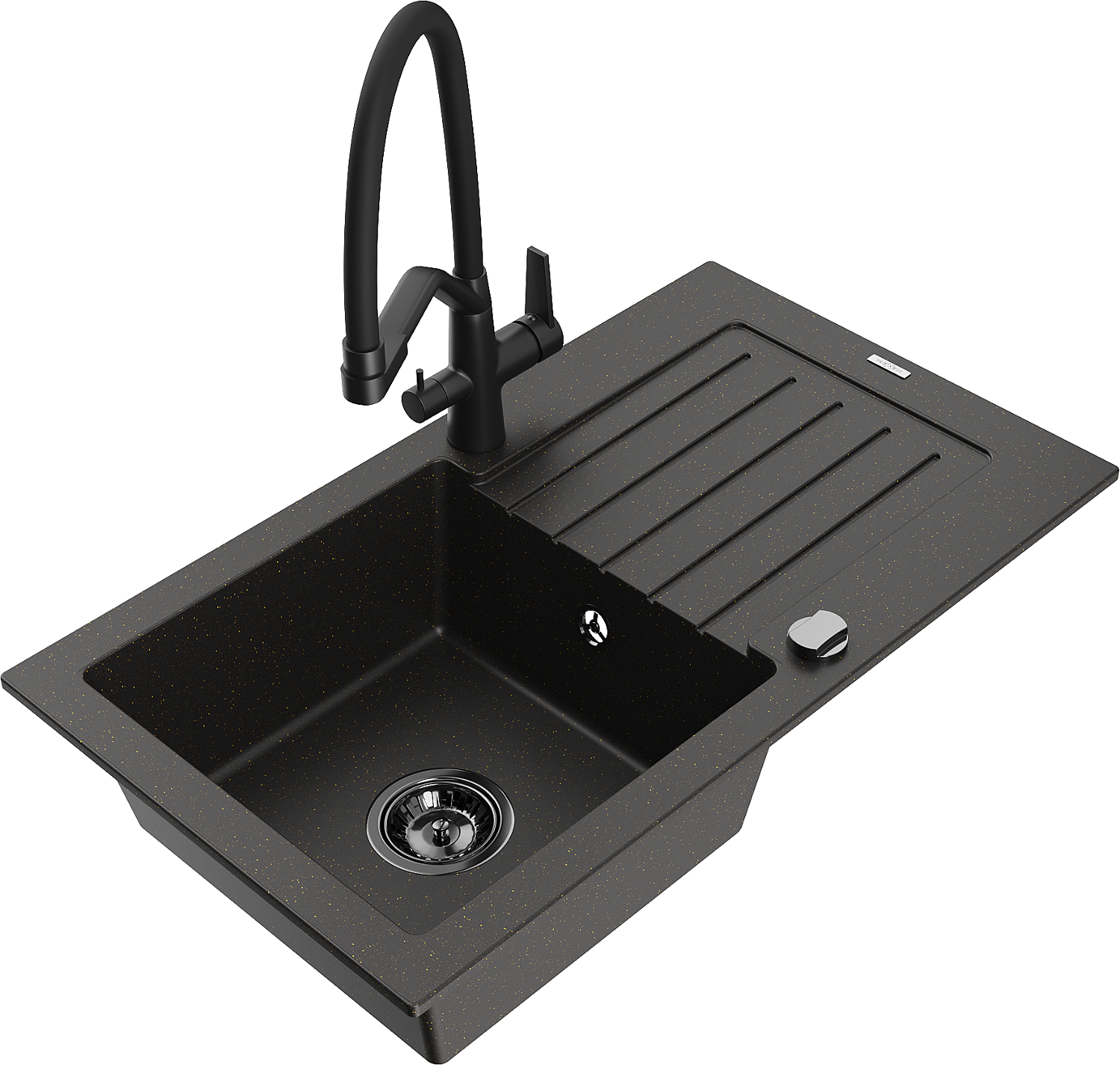 Mexen Pablo гранитна мивка с 1 корито с отцедник и кухненски смесител Duo, черен/златен металик - 6510-75-671701-70-B
