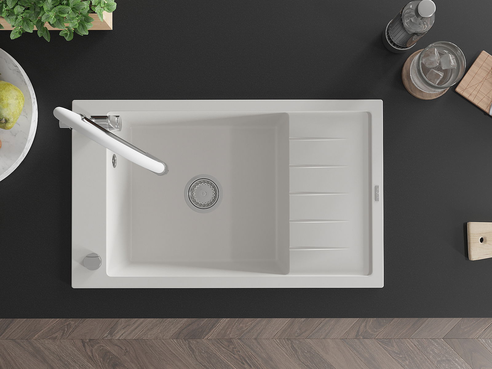 Mexen Elias еднокамерна гранитна мивка с отцедник и кухня батерия Duo, бял - 6511-20-671701-02
