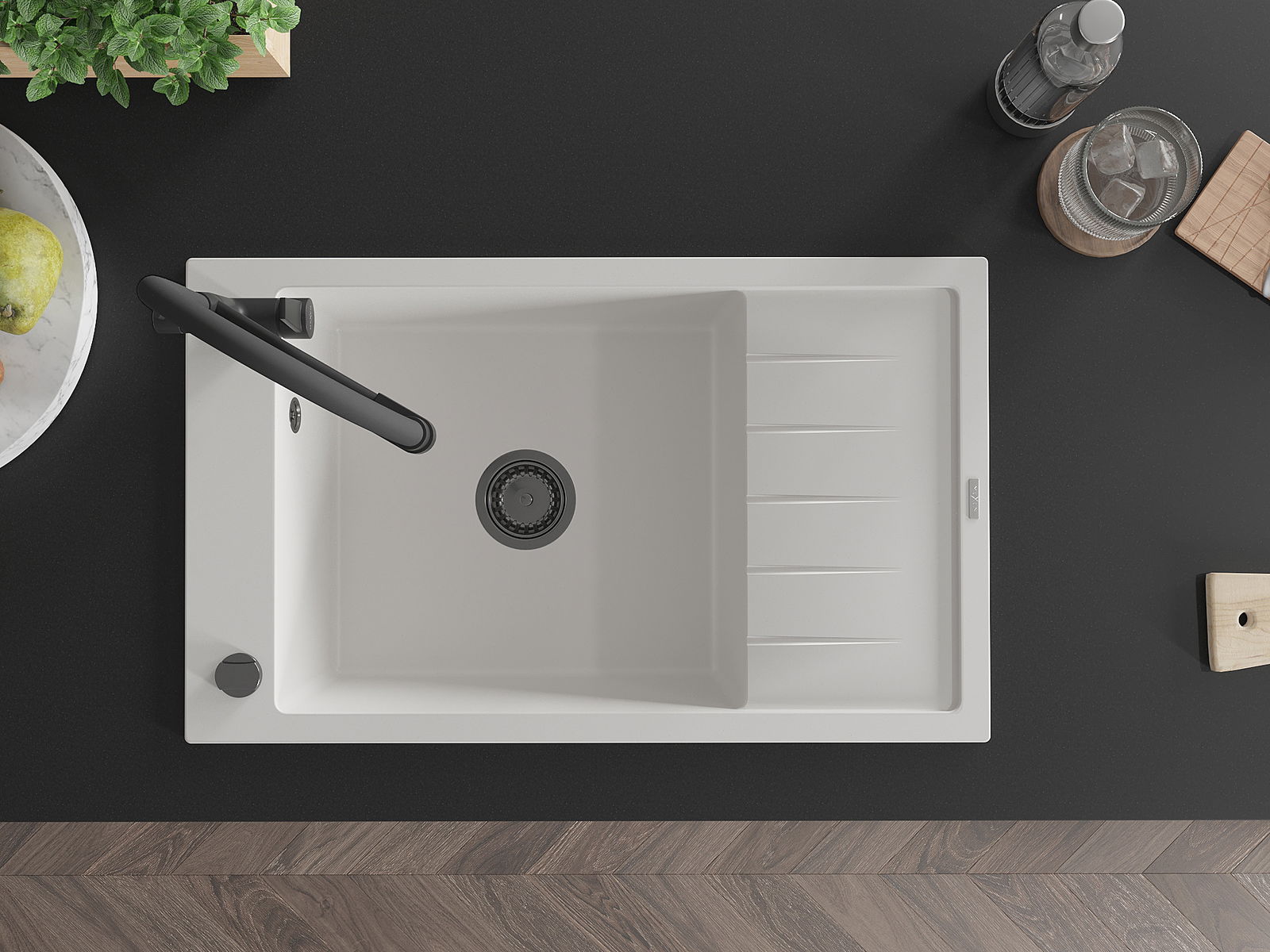 Mexen Elias гранитна кухненска мивка 1-коморна с отцедник и кухненски смесител Duo, бял - 6511-20-671701-70-B