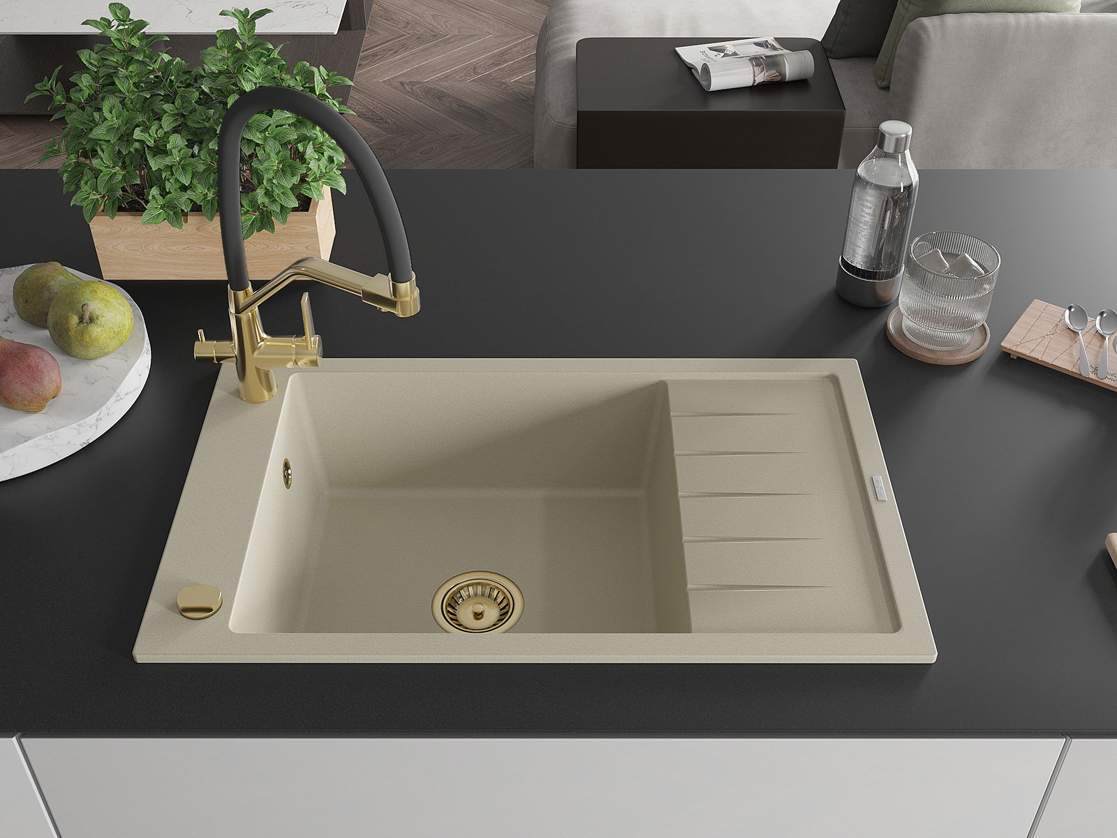Мивката е направена от висококачествен гранит. Това е елегантно и най -вече практично допълнение към всяка кухня, независимо от нейния стил. Висококачествената и гранитна издръжливост осигуряват много години употреба.