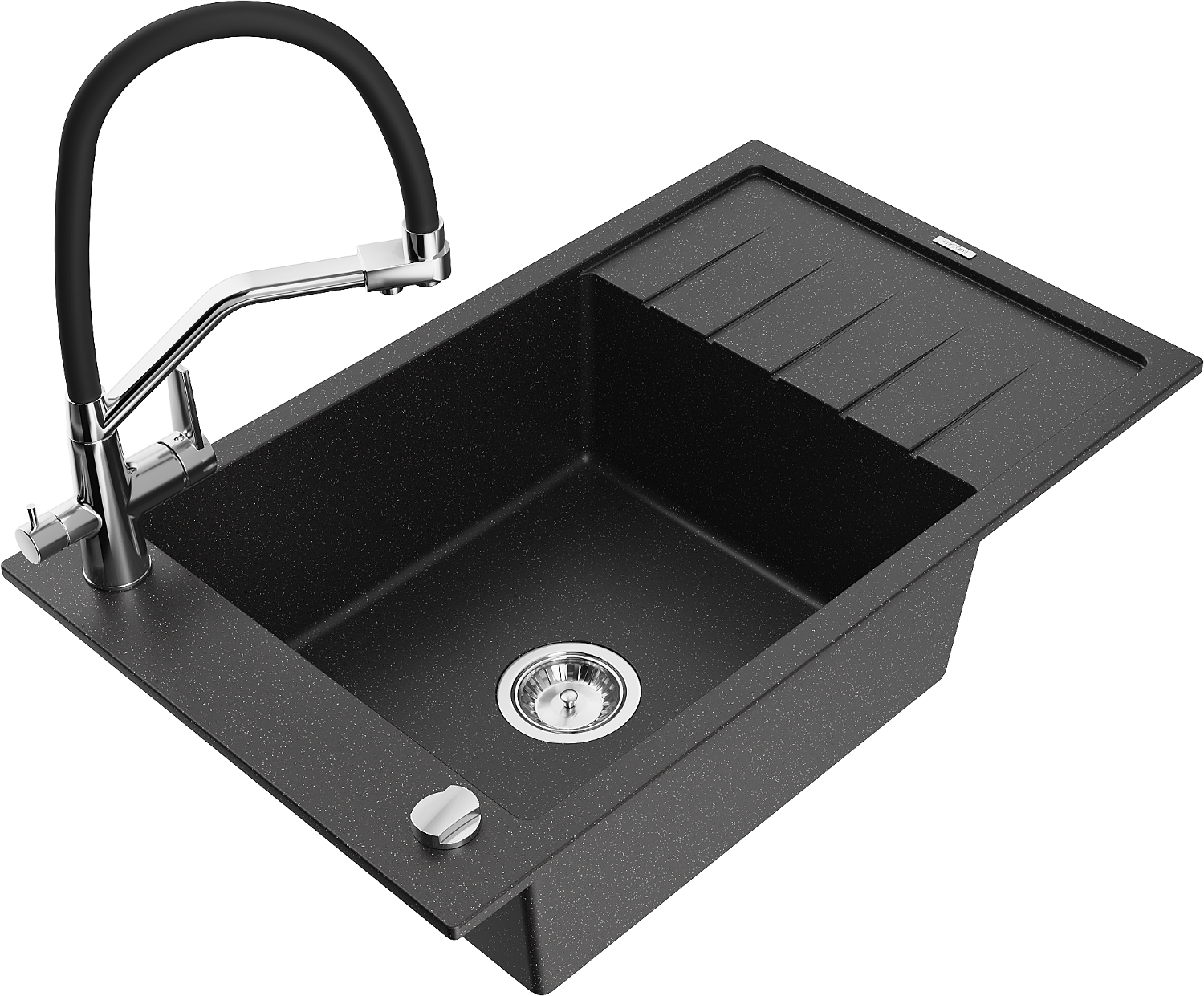 Мексен Елиас гранитна кухненска мивка 1-камерна с отцеждач и кухненски смесител Дуо, черно/сребърен металик - 6511-73-671701-07