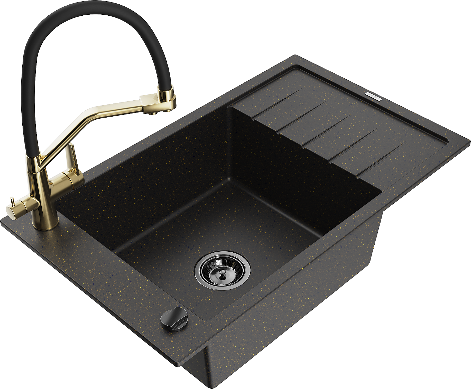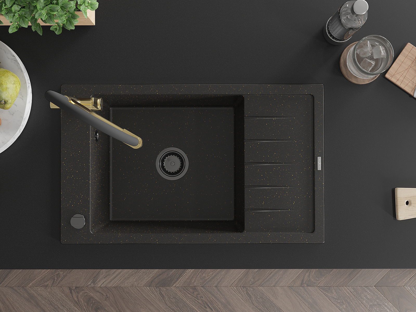 Mexen Elias гранитна мивка с 1 отделение с капак и кухненски смесител Duo, черно/златно металик - 6511-75-671701-57-B