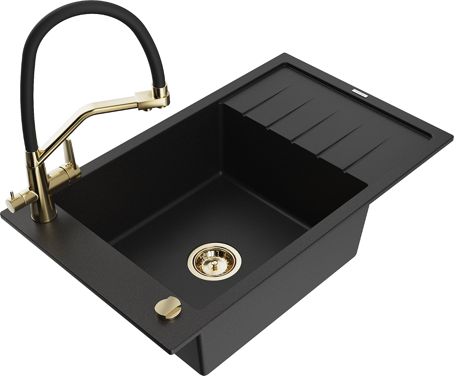 Mexen Elias мивка за вграждане, гранитна, с едно корито и отцедник, с кухненски смесител Duo, черен - 6511-77-671701-57-G