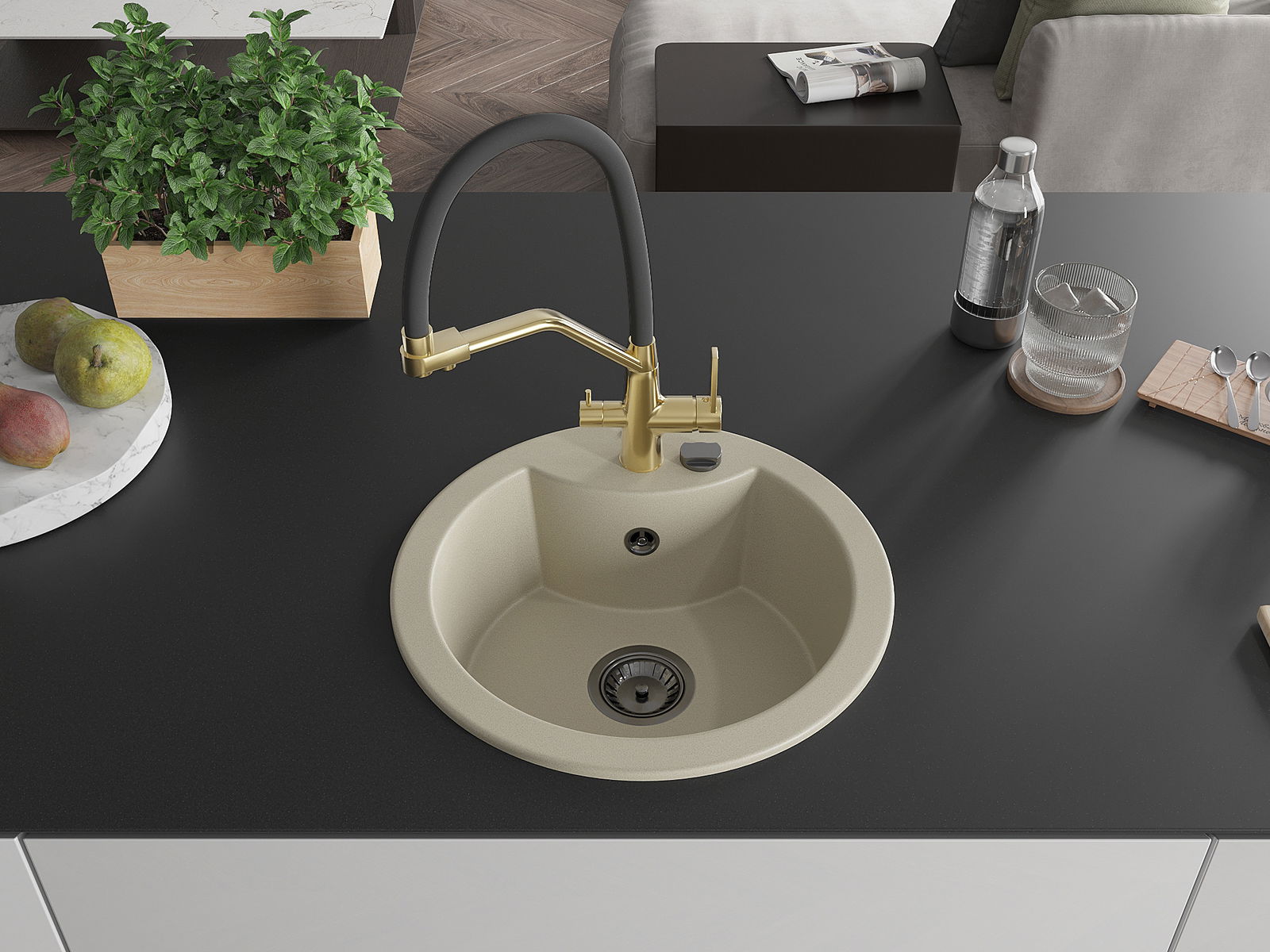 Мивката е направена от висококачествен гранит. Това е елегантно и най -вече практично допълнение към всяка кухня, независимо от нейния стил. Висококачествената и гранитна издръжливост осигуряват много години употреба.