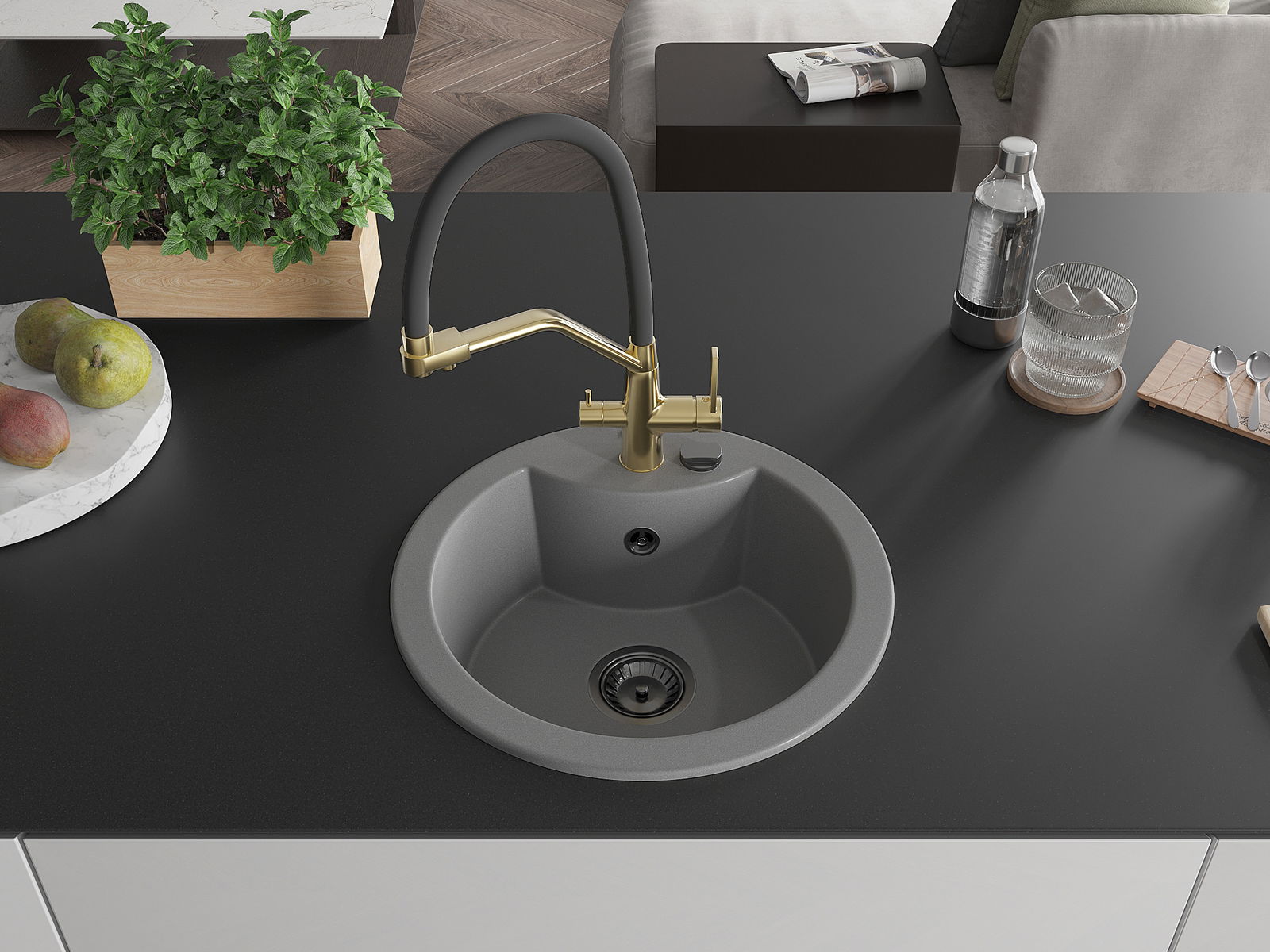 Мивката е направена от висококачествен гранит. Това е елегантно и най -вече практично допълнение към всяка кухня, независимо от нейния стил. Висококачествената и гранитна издръжливост осигуряват много години употреба.
