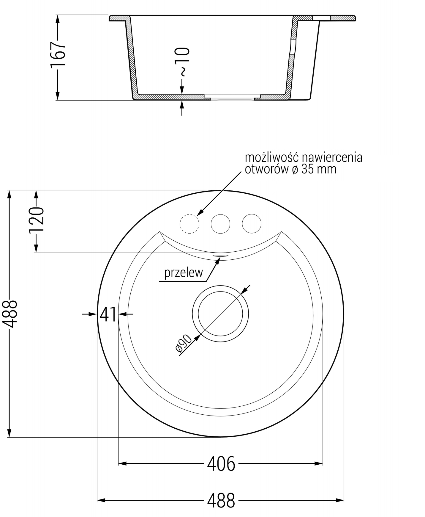 Мивката разполага с предварително издълбан отвор с диаметър 35 мм за самостоятелно изключване. Може да се използва, наред с други неща, за монтаж на дозатор за течност, който ще елиминира наличието на пластмасови бутилки в кухнята и ще й придаде елегантно завършване.
