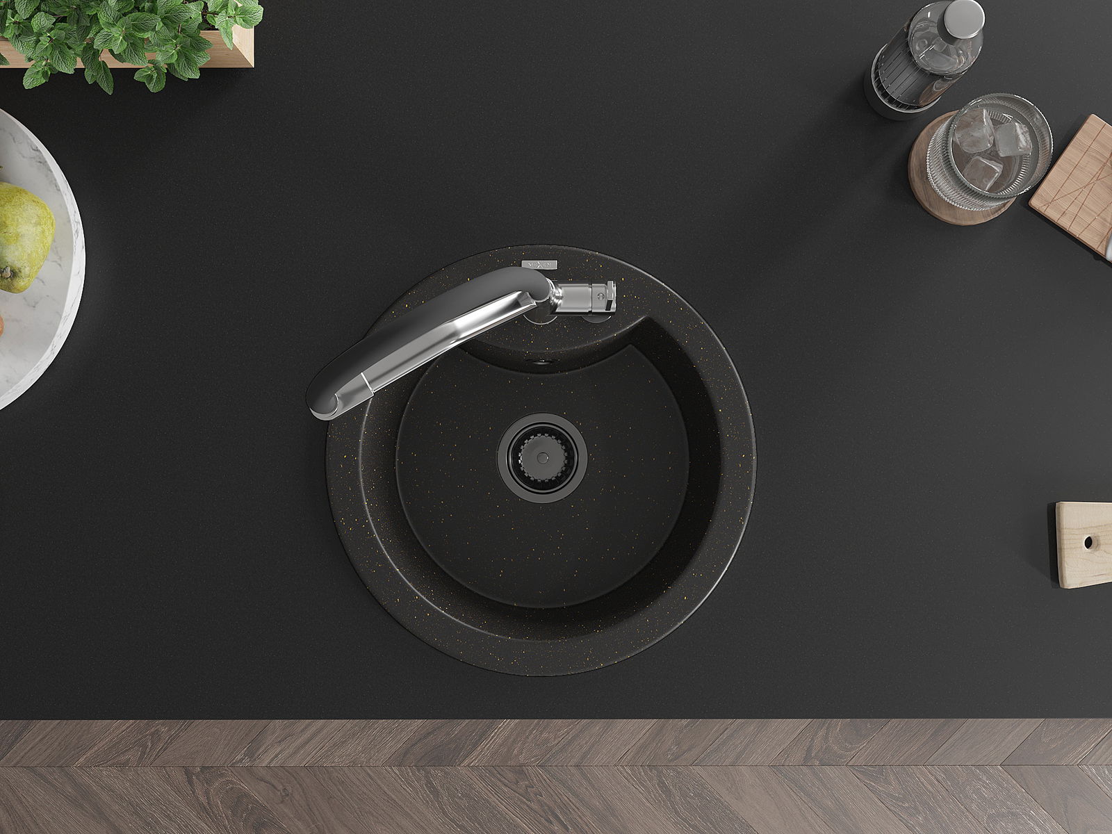 Mexen Diego гранитна мивка с 1 камера и кухненски смесител Duo, черен/златист металик - 6512-75-671701-07-B