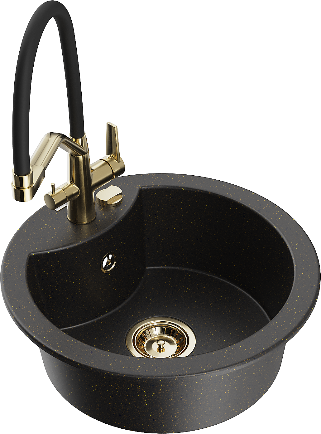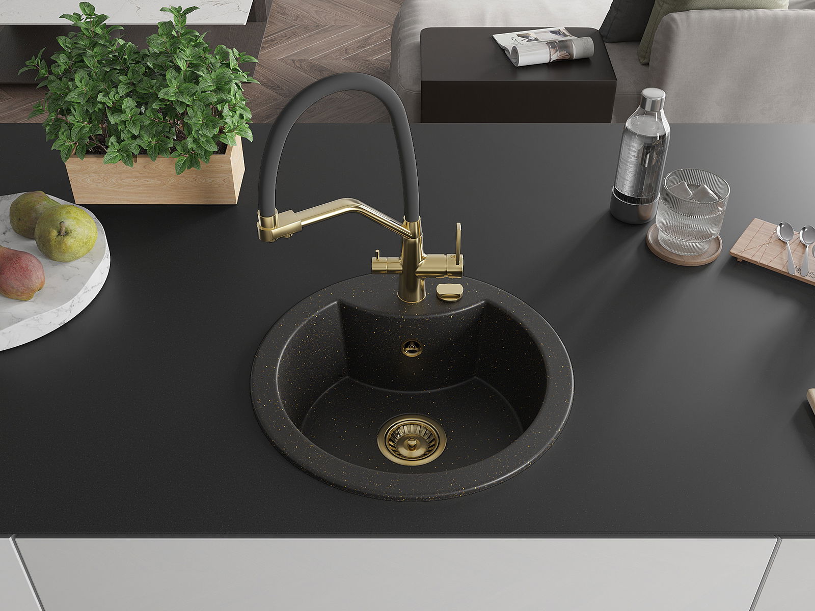 Mexen Diego гранитна мивка с 1 отделение и кухненски смесител Duo, черен/златен металик - 6512-75-671701-57-G