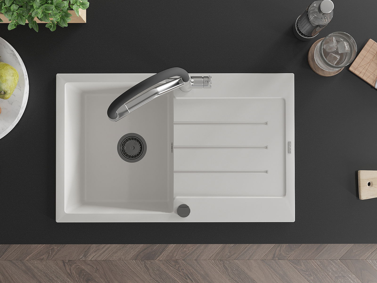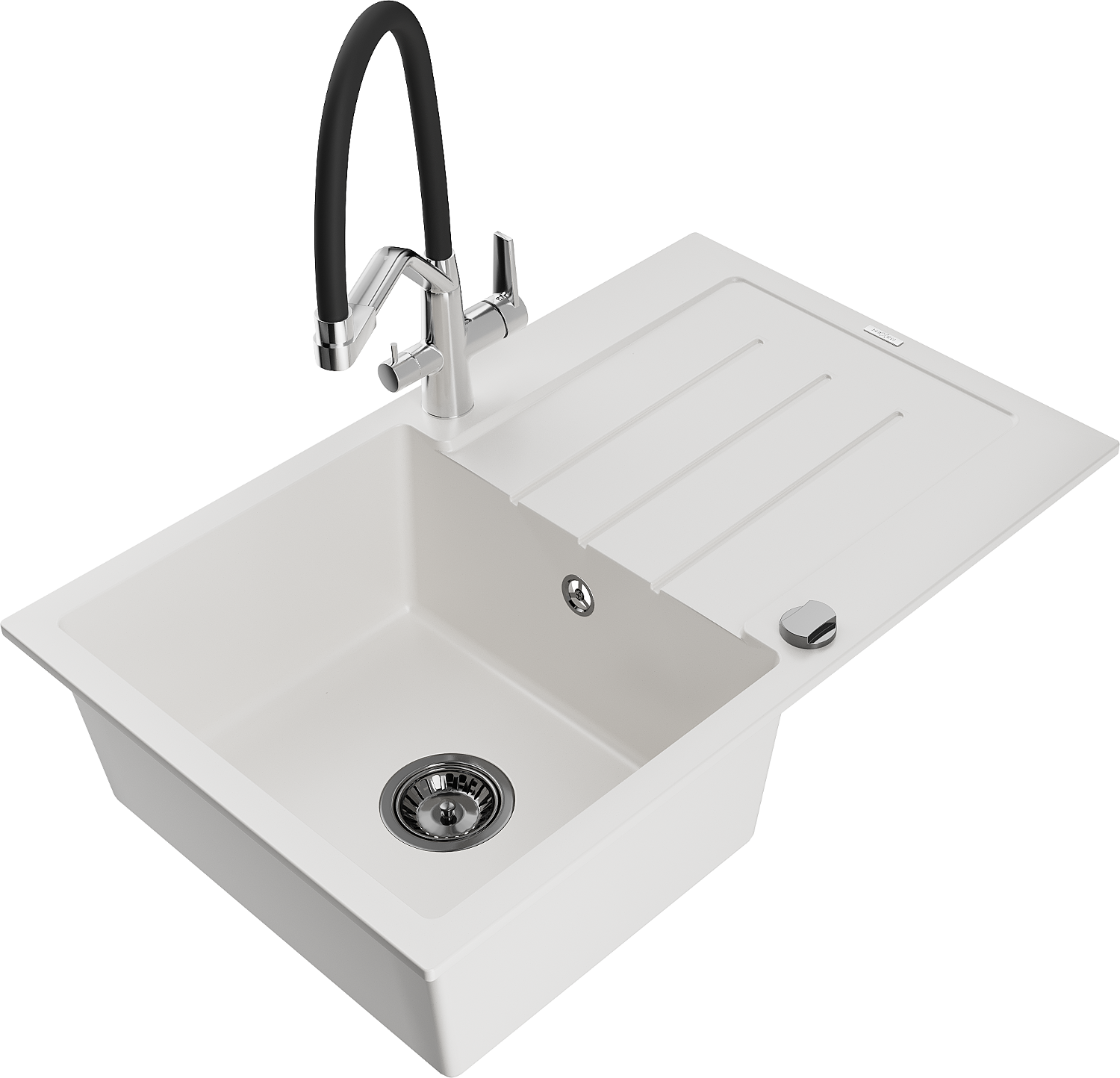 Mexen Bruno еднокамерен гранитен мивка с отцедник и кухненски смесител Duo, бял - 6513-20-671701-07-B