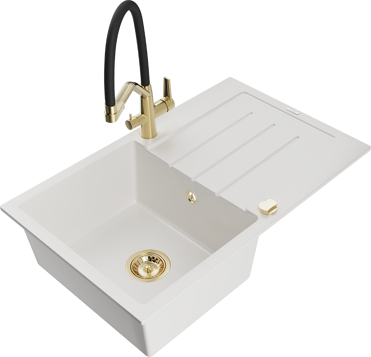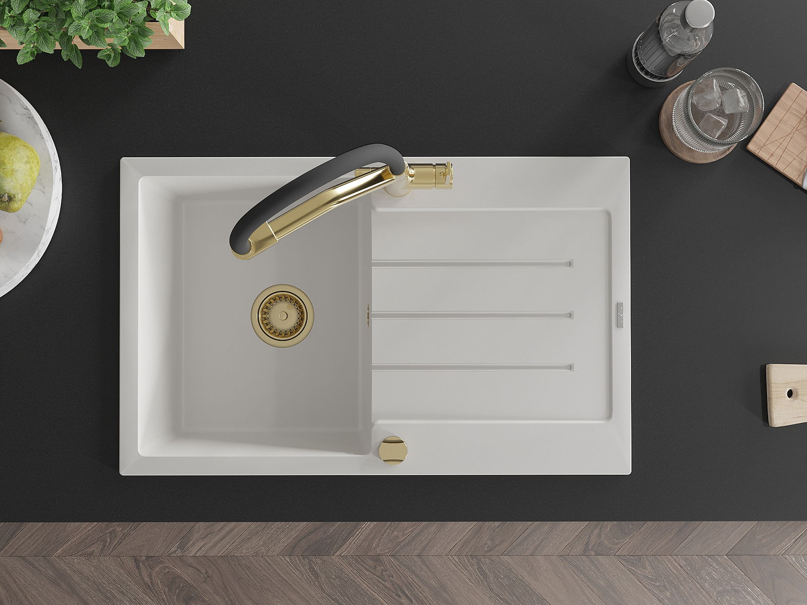 Granitна кухненска мивка Mexen Bruno с 1 отделение и отцедник и кухненски смесител Duo, бял - 6513-20-671701-57-G