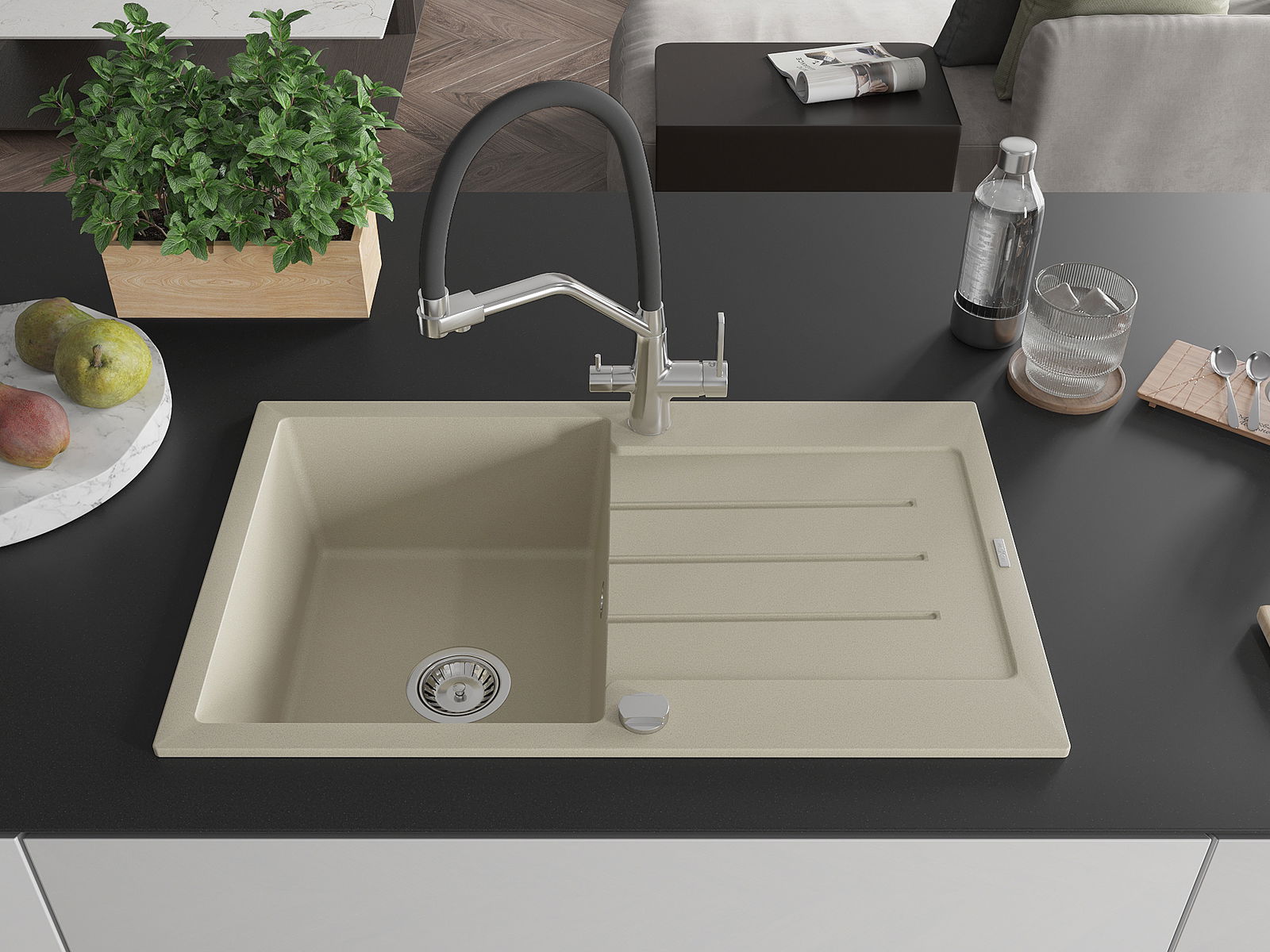 Мивката е направена от висококачествен гранит. Това е елегантно и най -вече практично допълнение към всяка кухня, независимо от нейния стил. Висококачествената и гранитна издръжливост осигуряват много години употреба.