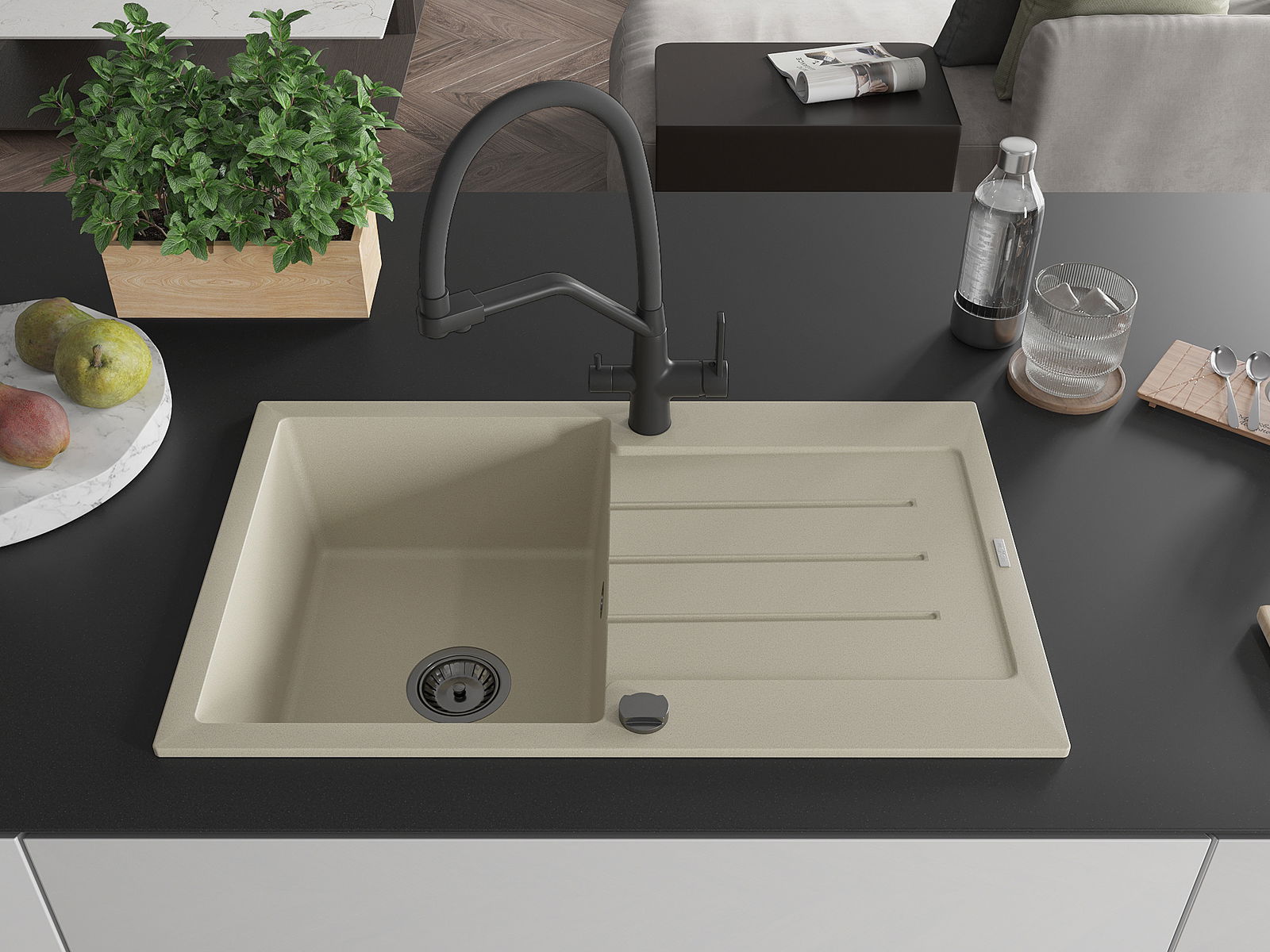 Мивката е направена от висококачествен гранит. Това е елегантно и най -вече практично допълнение към всяка кухня, независимо от нейния стил. Висококачествената и гранитна издръжливост осигуряват много години употреба.