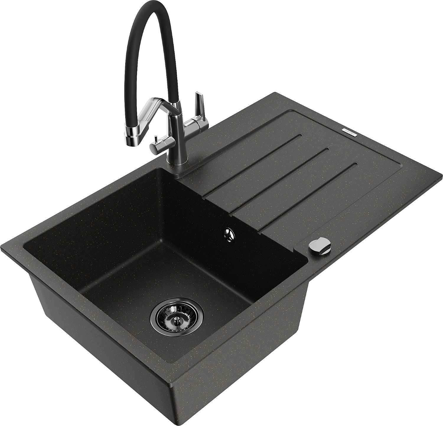 Mexen Bruno гранитна мивка с 1 отделение с отцедище и кухненски смесител Duo, черно/златист металик - 6513-75-671701-07-B