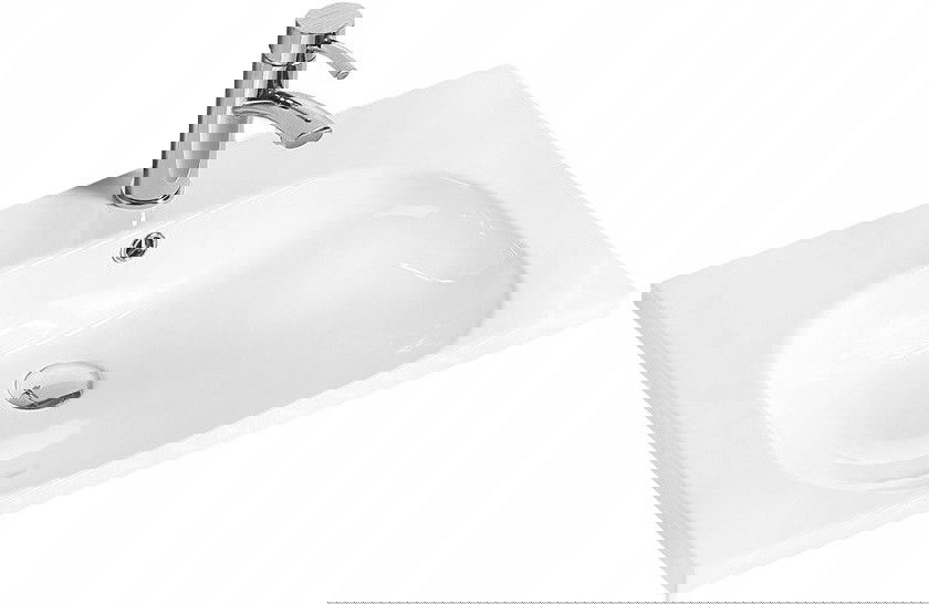 Мивката има дупка, в която можем да монтираме батерията. Това спестява ценно пространство в банята и подчертава естетиката му. Това решение също ви позволява лесно да се държите чисти около мивката.