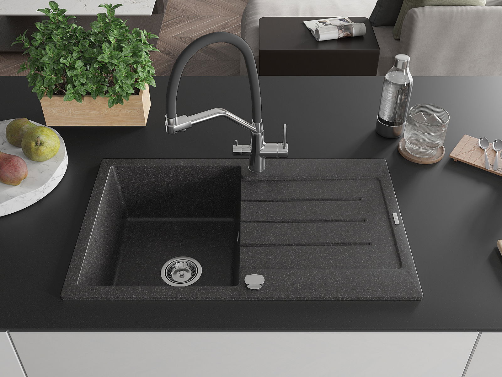 Мивката е направена от висококачествен гранит. Това е елегантно и най -вече практично допълнение към всяка кухня, независимо от нейния стил. Висококачествената и гранитна издръжливост осигуряват много години употреба.