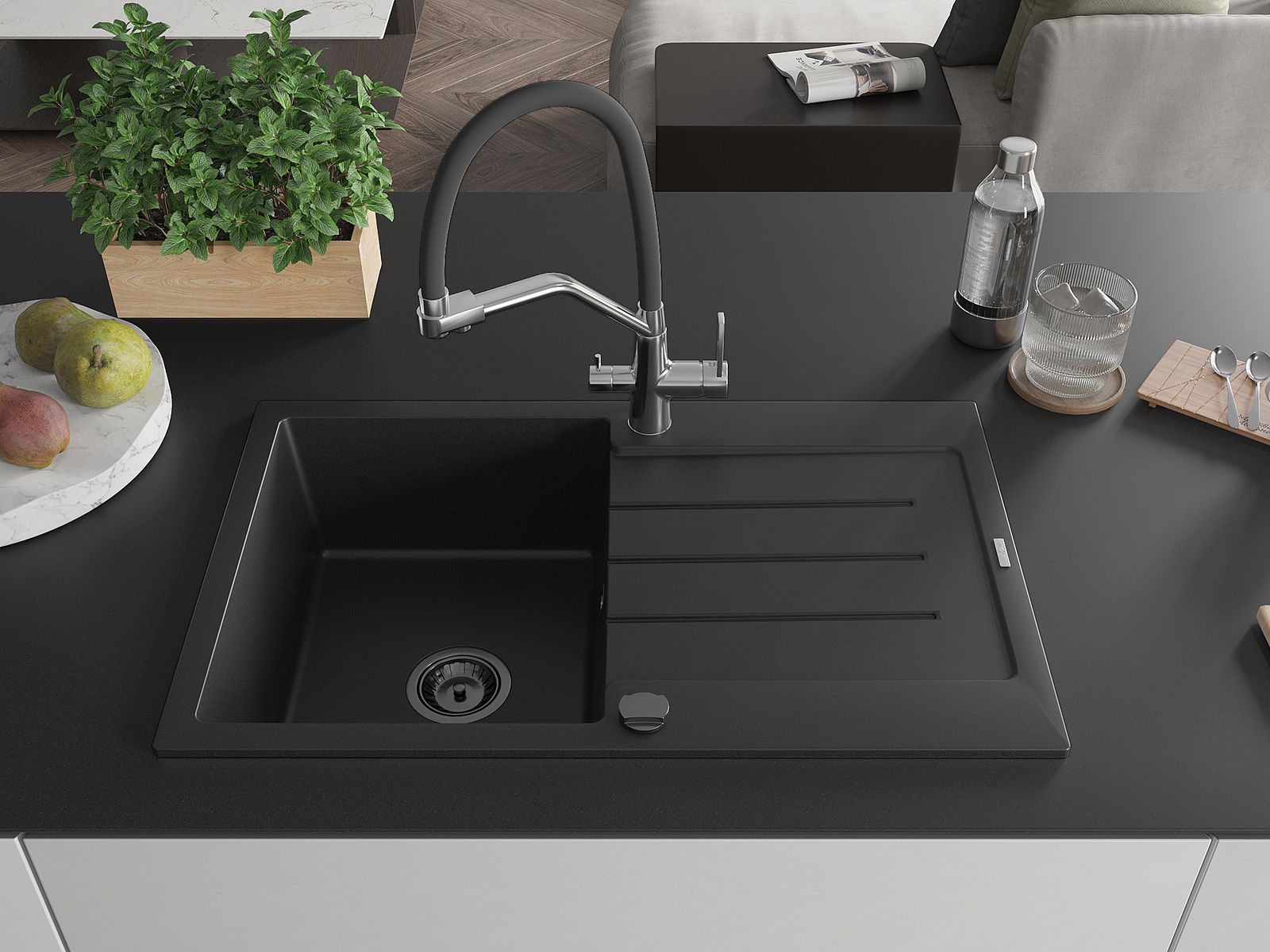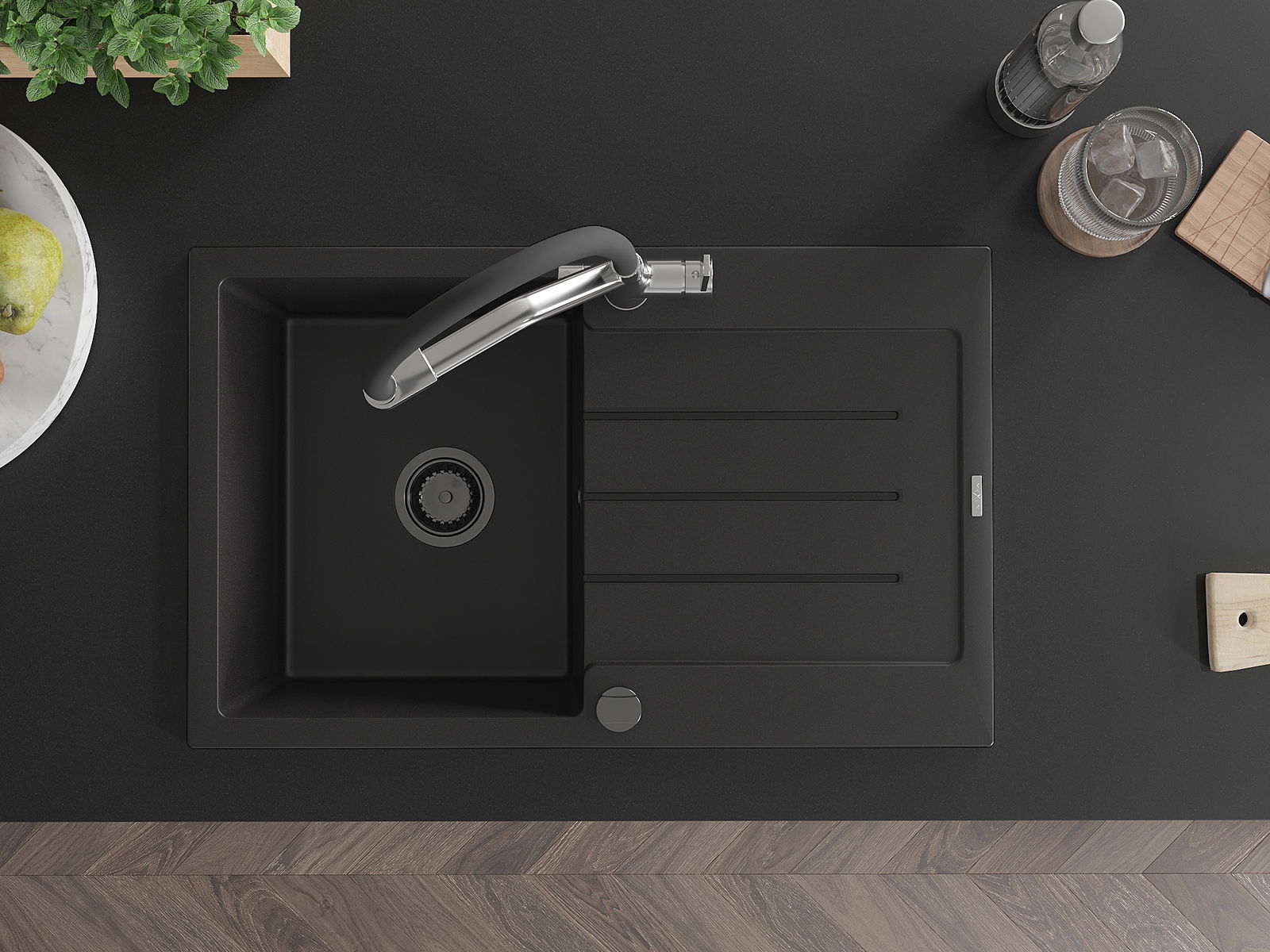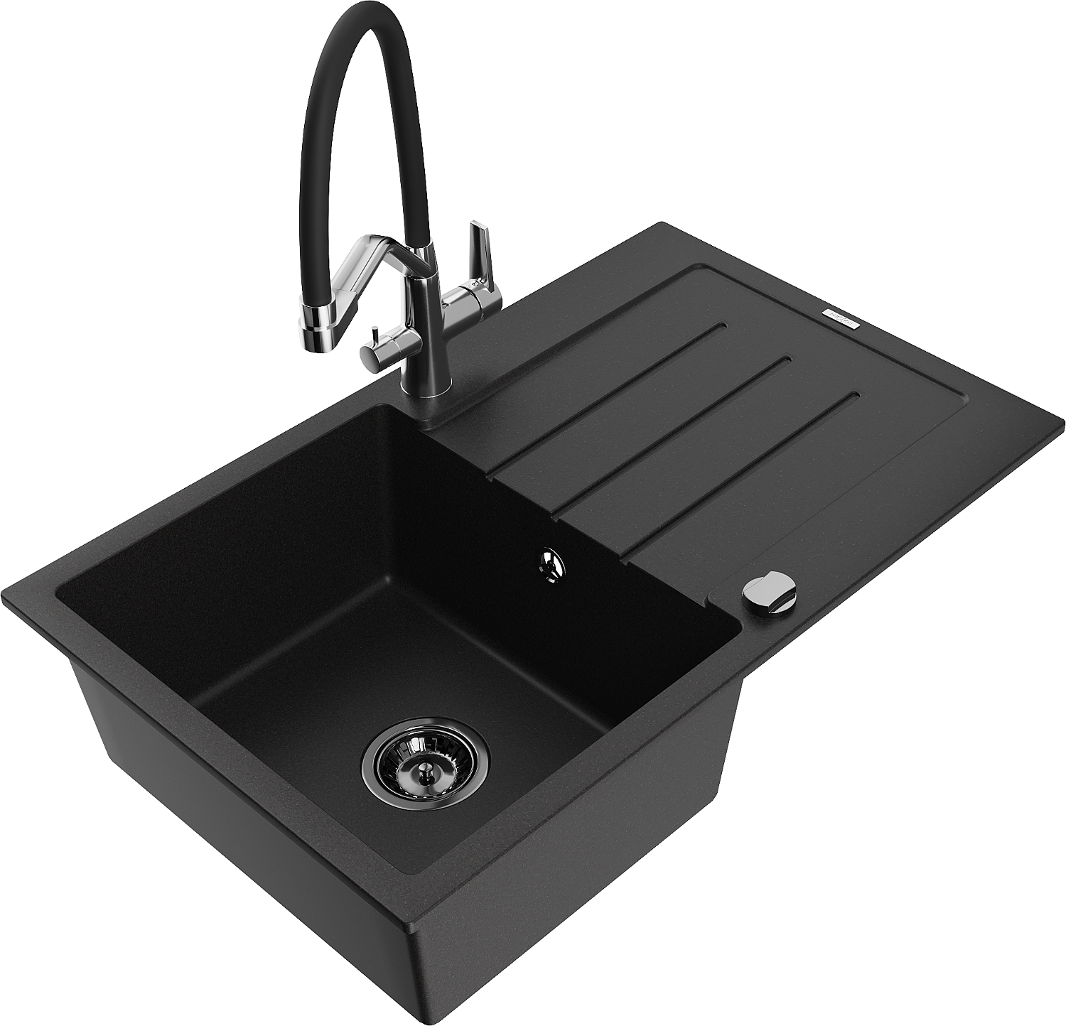 Mexen Bruno еднокоморна гранитна мивка с отцедник и кухненски смесител Duo, черен - 6513-77-671701-07-B