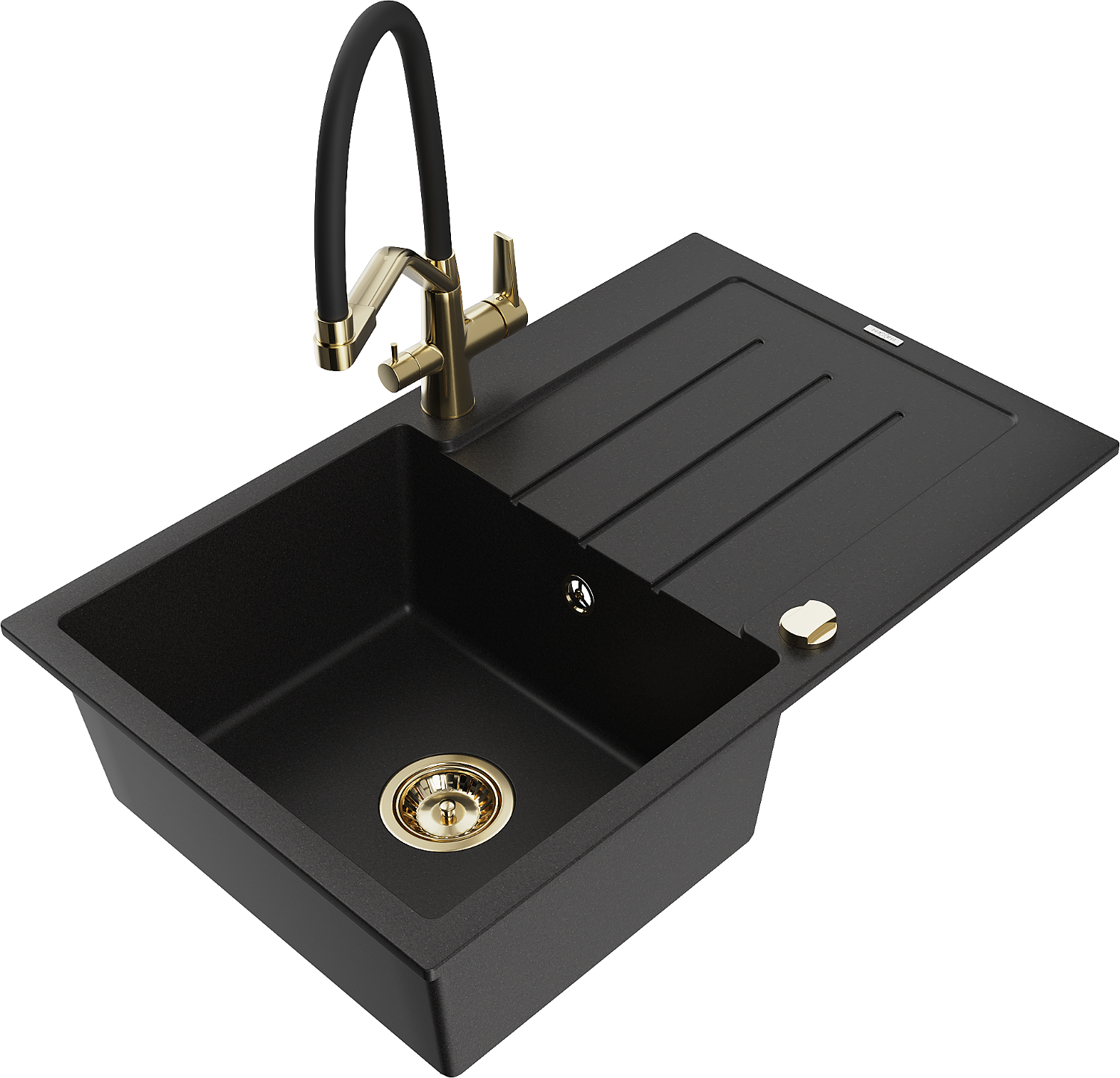 Mexen Bruno гранитна мивка 1-камерна с отцедник и кухненски кран Duo, черен - 6513-77-671701-57-G
