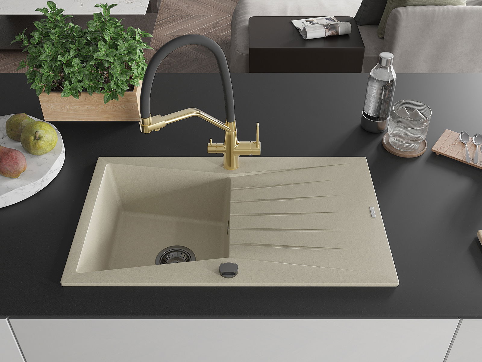 Мивката е направена от висококачествен гранит. Това е елегантно и най -вече практично допълнение към всяка кухня, независимо от нейния стил. Висококачествената и гранитна издръжливост осигуряват много години употреба.