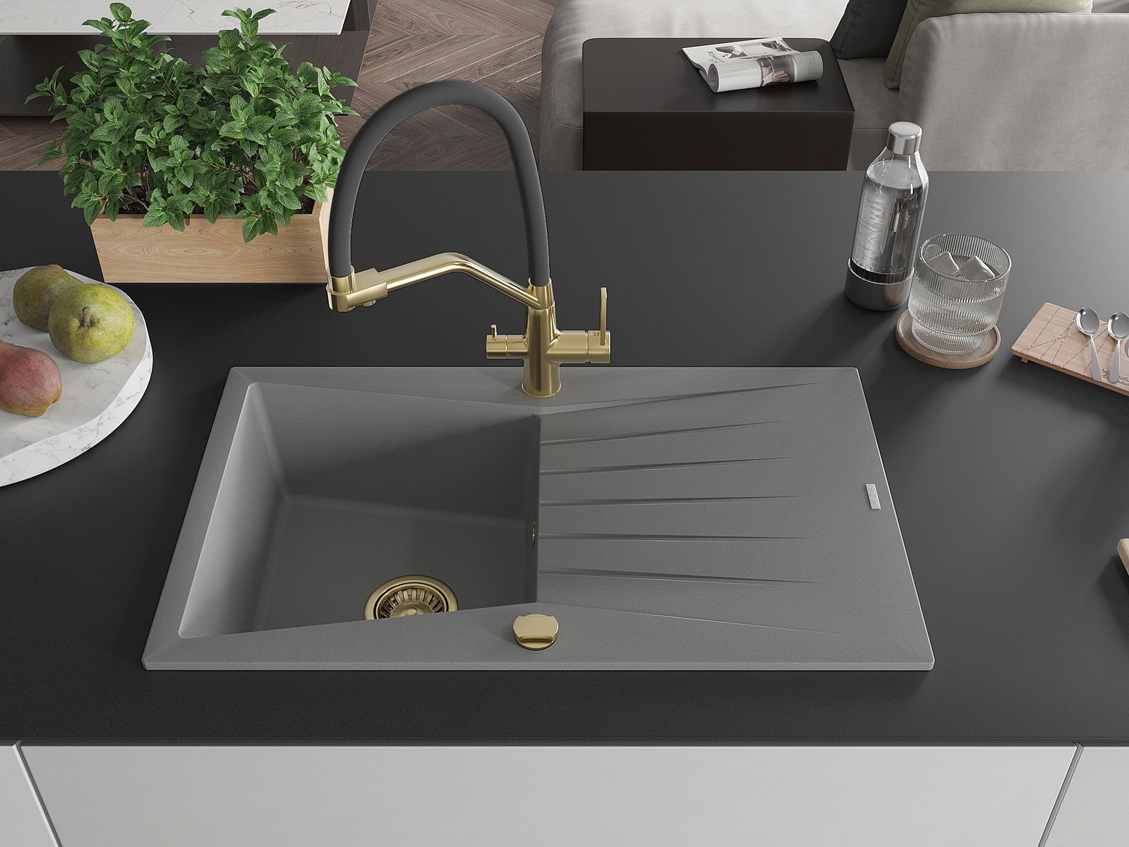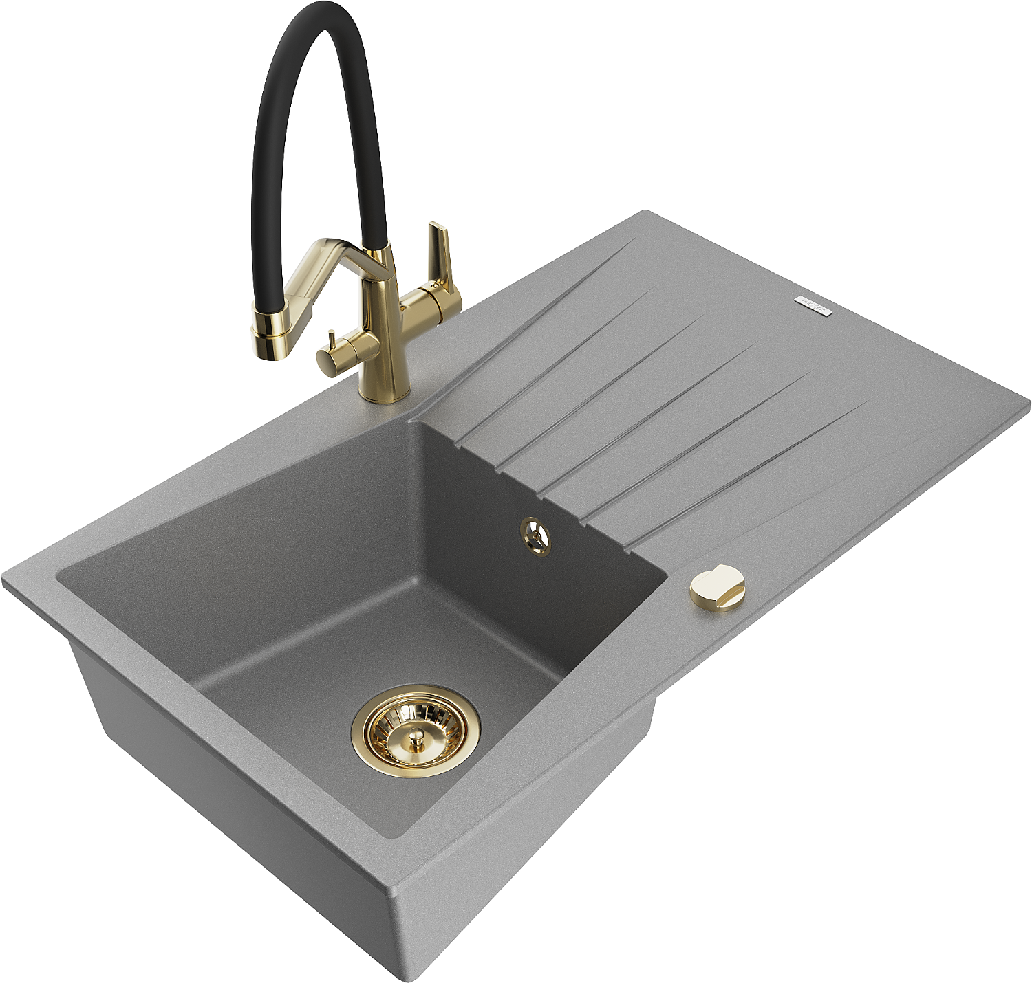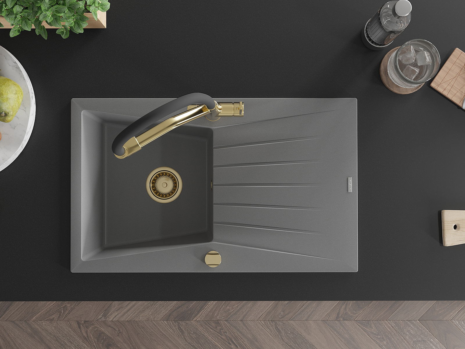 Mexen Cesar еднокоморна кухненска мивка от гранит с отцедник и кухненски смесител Duo, сив - 6514-71-671701-57-G