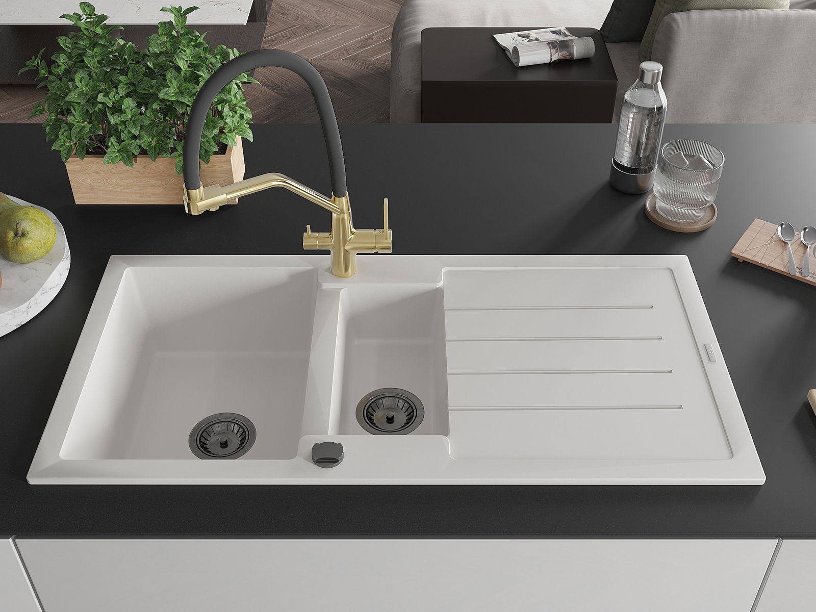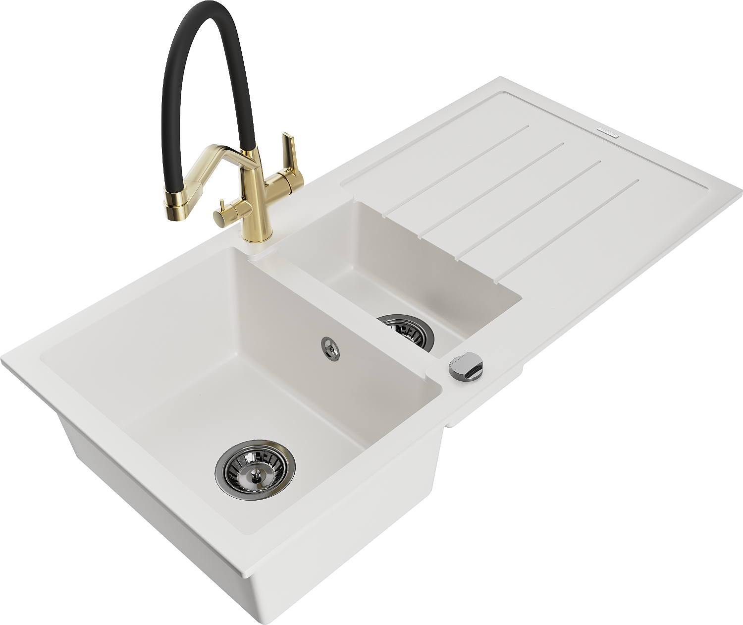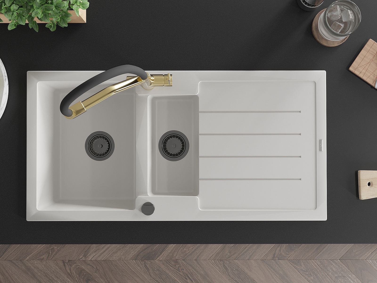 Mexen Andres гранитна кухненска мивка с 1,5 камери с отцедник и кухненски смесител Duo, бял - 6515-20-671701-57-B