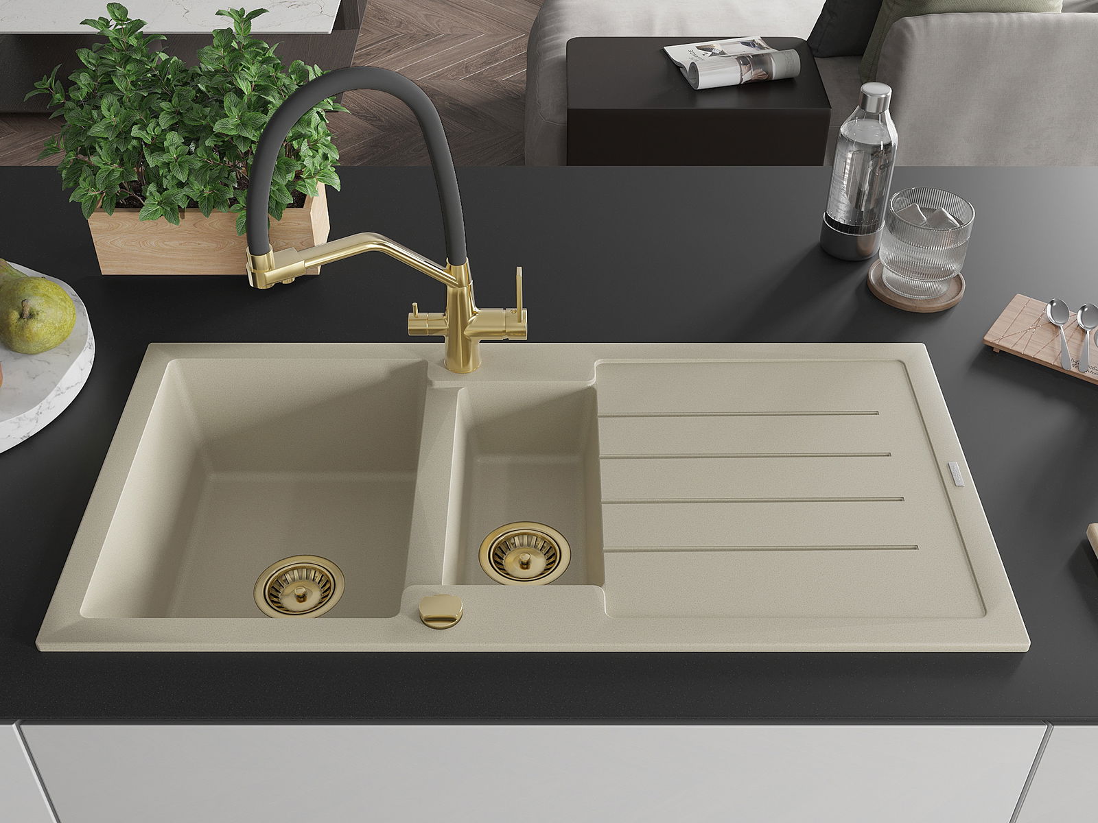 Mexen Andres гранитна мивка 1,5-камерна с отцедник и кухненска батерия Duo, бежов - 6515-69-671701-57-G