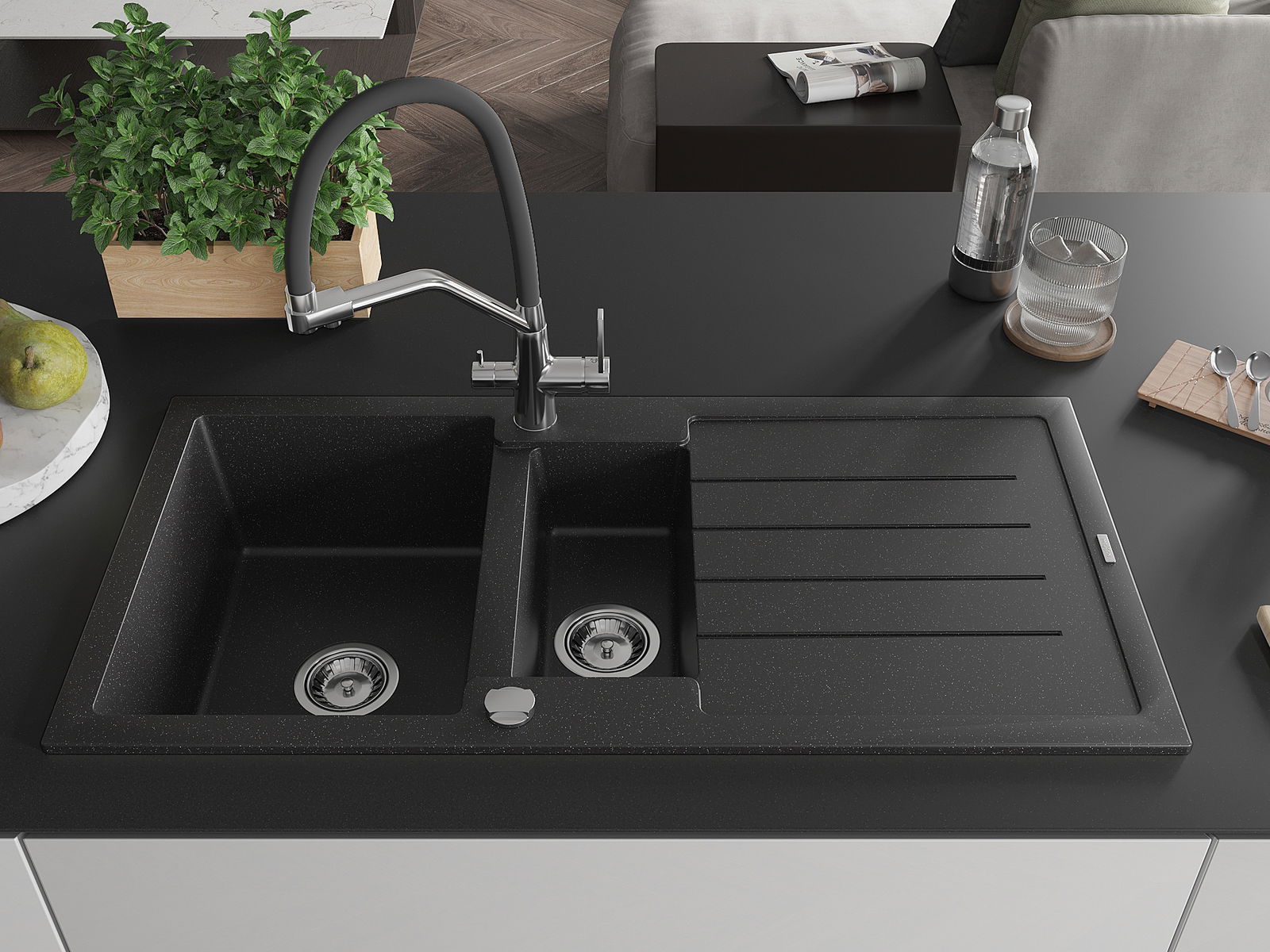 Мивката е направена от висококачествен гранит. Това е елегантно и най -вече практично допълнение към всяка кухня, независимо от нейния стил. Висококачествената и гранитна издръжливост осигуряват много години употреба.