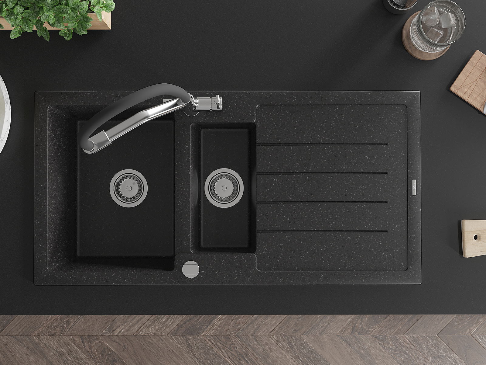 Mexen Andres 1,5-коморов гранитен кухненски мивка с отцеждач и кухненски смесител Duo, черен/сребрист металик - 6515-73-671701-?