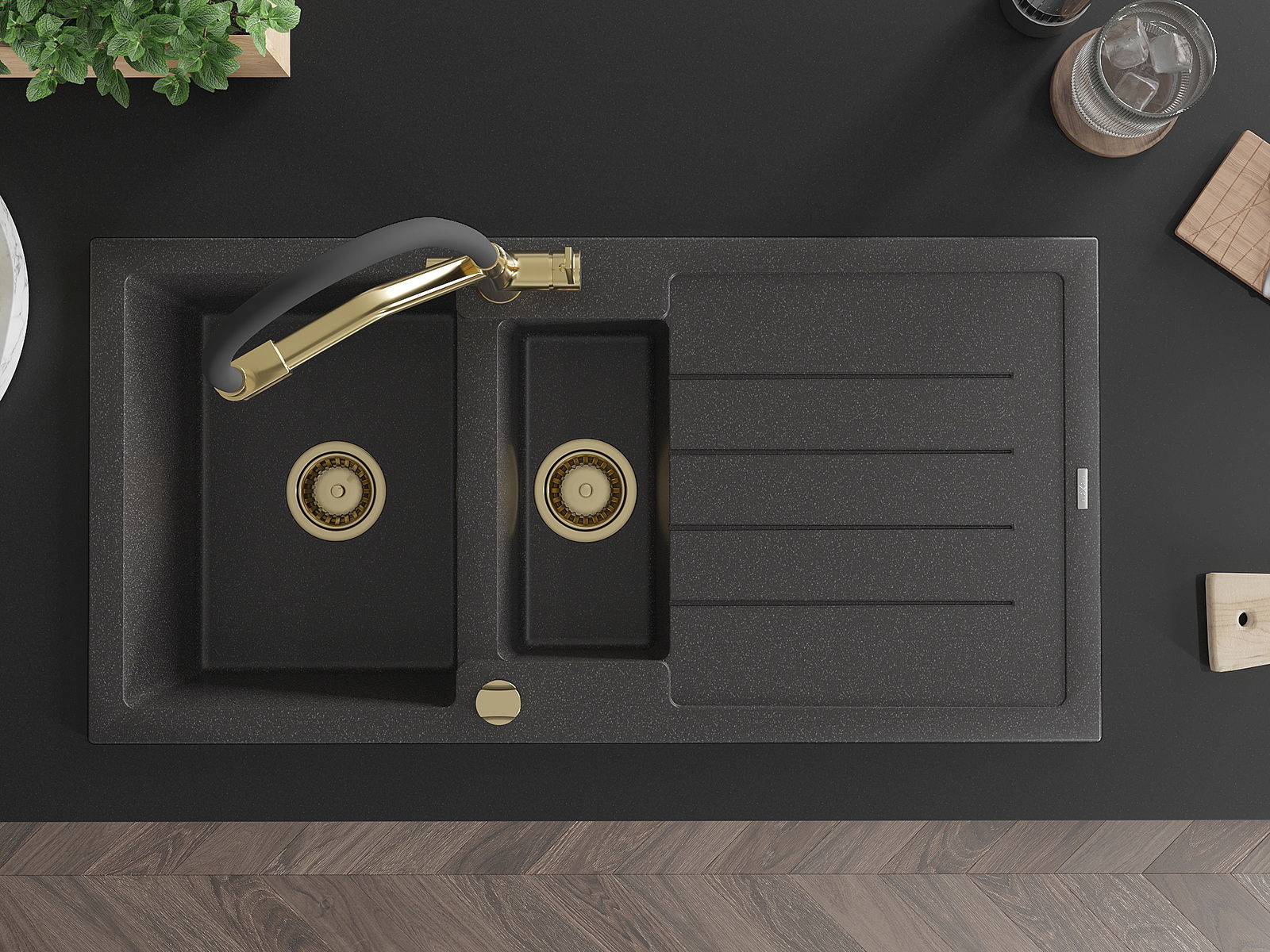 Mexen Andres еднократно мивка от гранит с 1,5 камери и отцедник и кухненски смесител Duo, черен на точки - 6515-76-671701-57-G