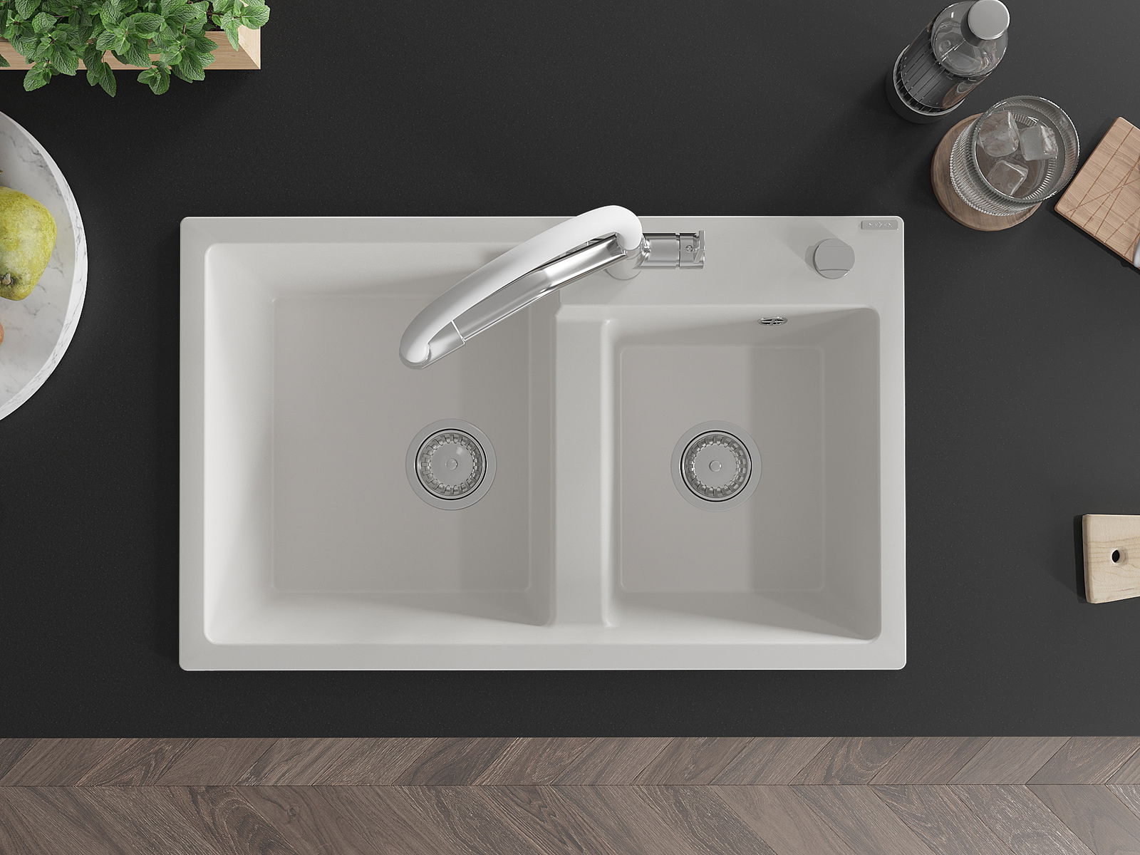 Mexen Tomas кухненска мивка гранитна 2-камерна с кухненски смесител Duo, бял - 6516-20-671701-02