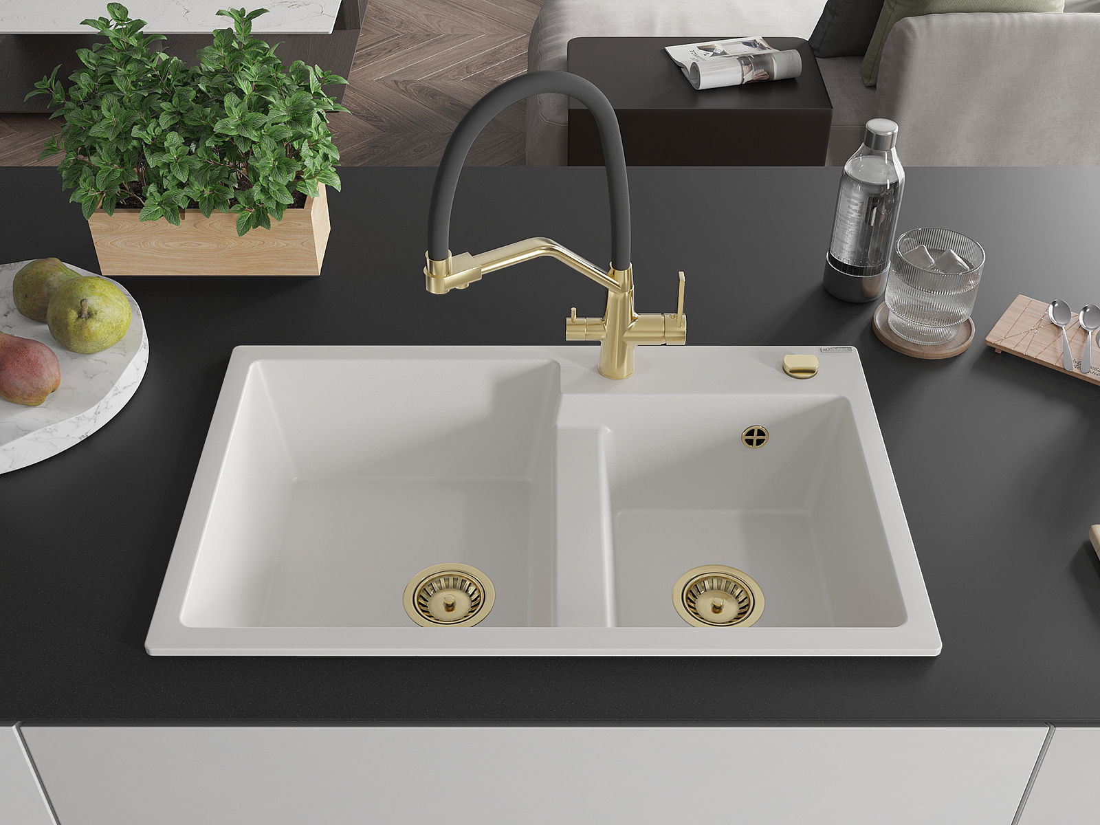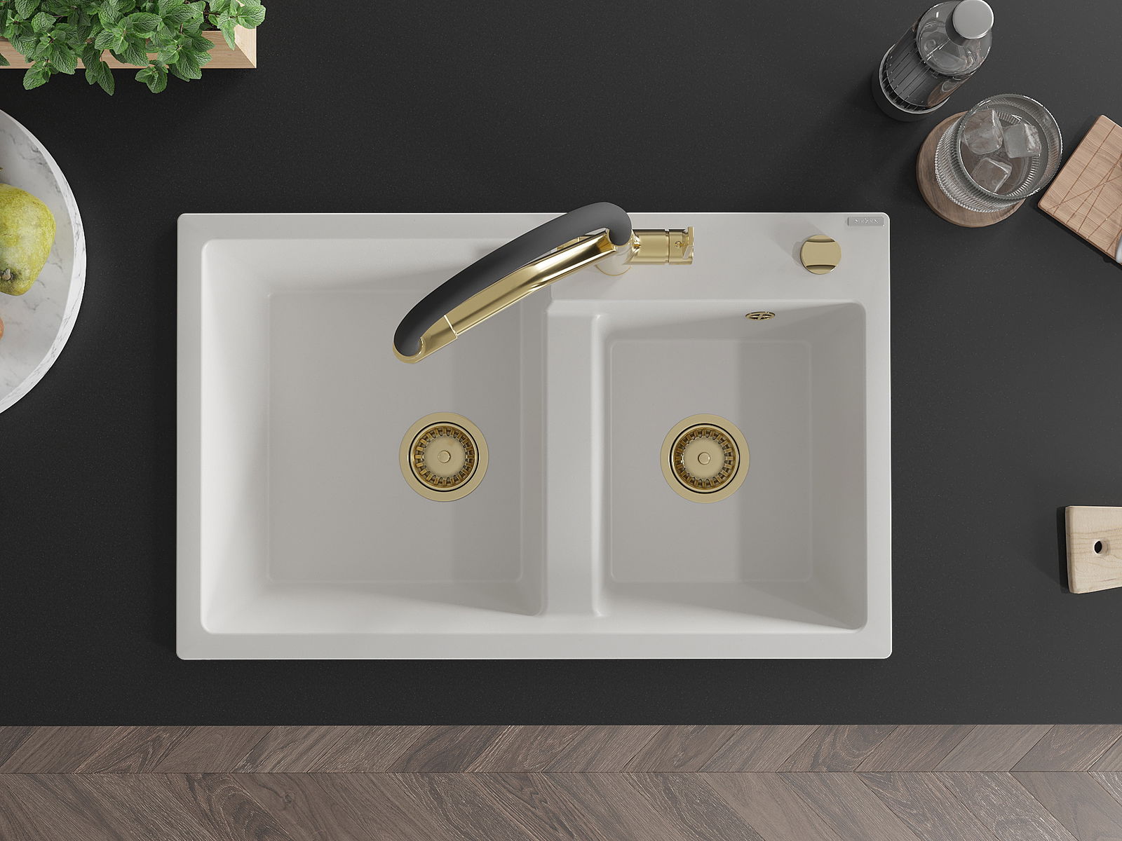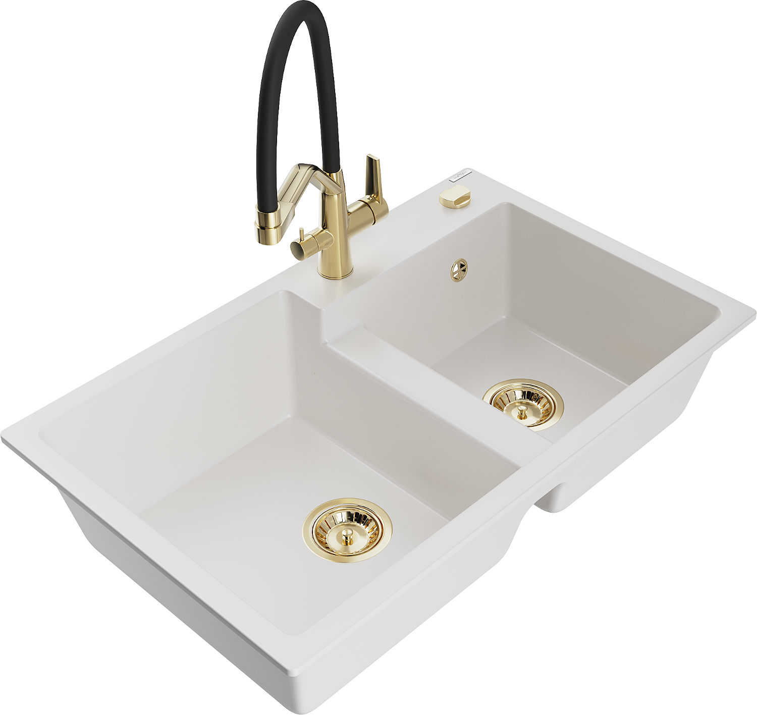 Mexen Tomas двукамерна гранитна мивка с кухненски смесител Duo, бял - 6516-20-671701-57-G