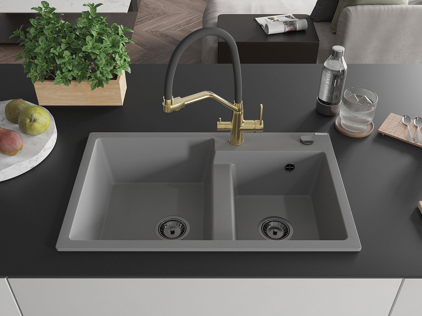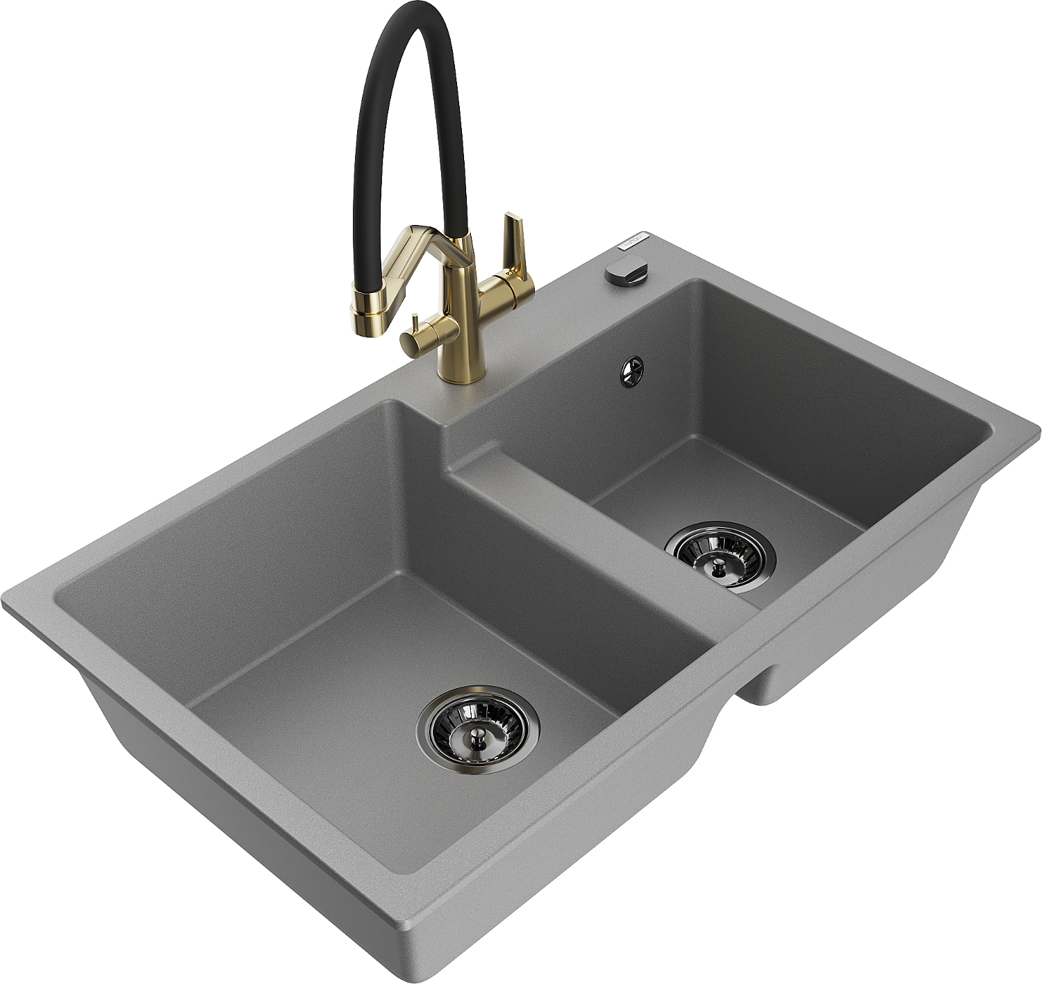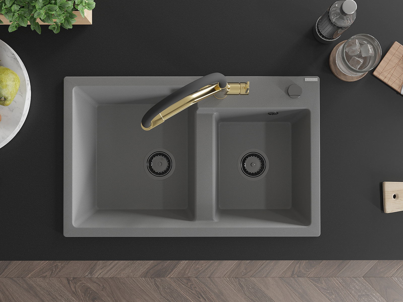 Mexen Tomas гранитна кухненска мивка с две камери и кухненски смесител Duo, сив - 6516-71-671701-57-B