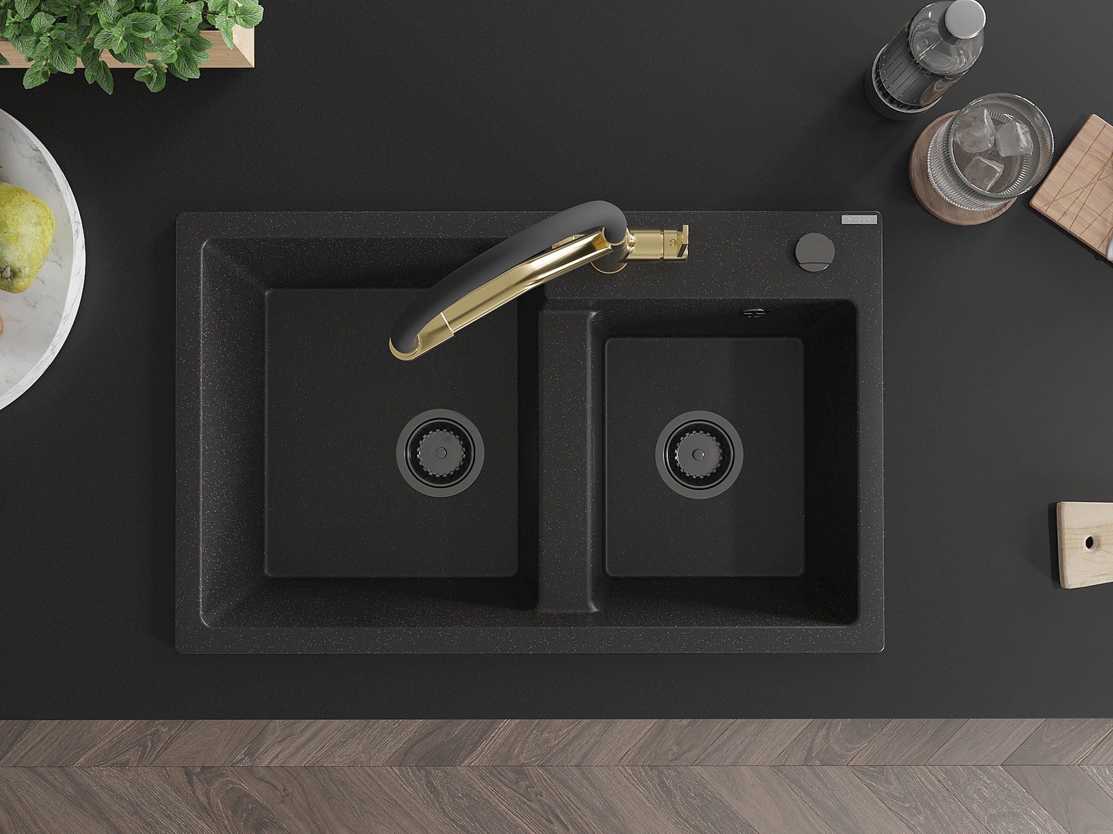 Mexen Tomas гранитна мивка с 2 камери с кухненски смесител Duo, черен/сребърен металик - 6516-73-671701-57-B
