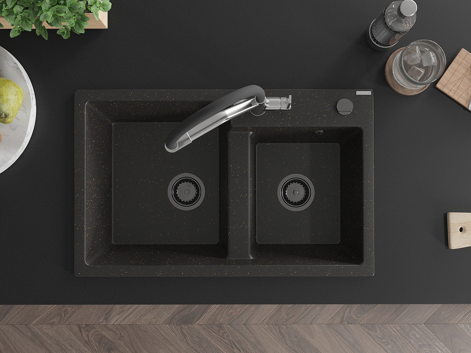 Mexen Tomas кухненска мивка гранитна 2-камерна с кухненски смесител Duo, черен/златен металик - 6516-75-671701-07-B