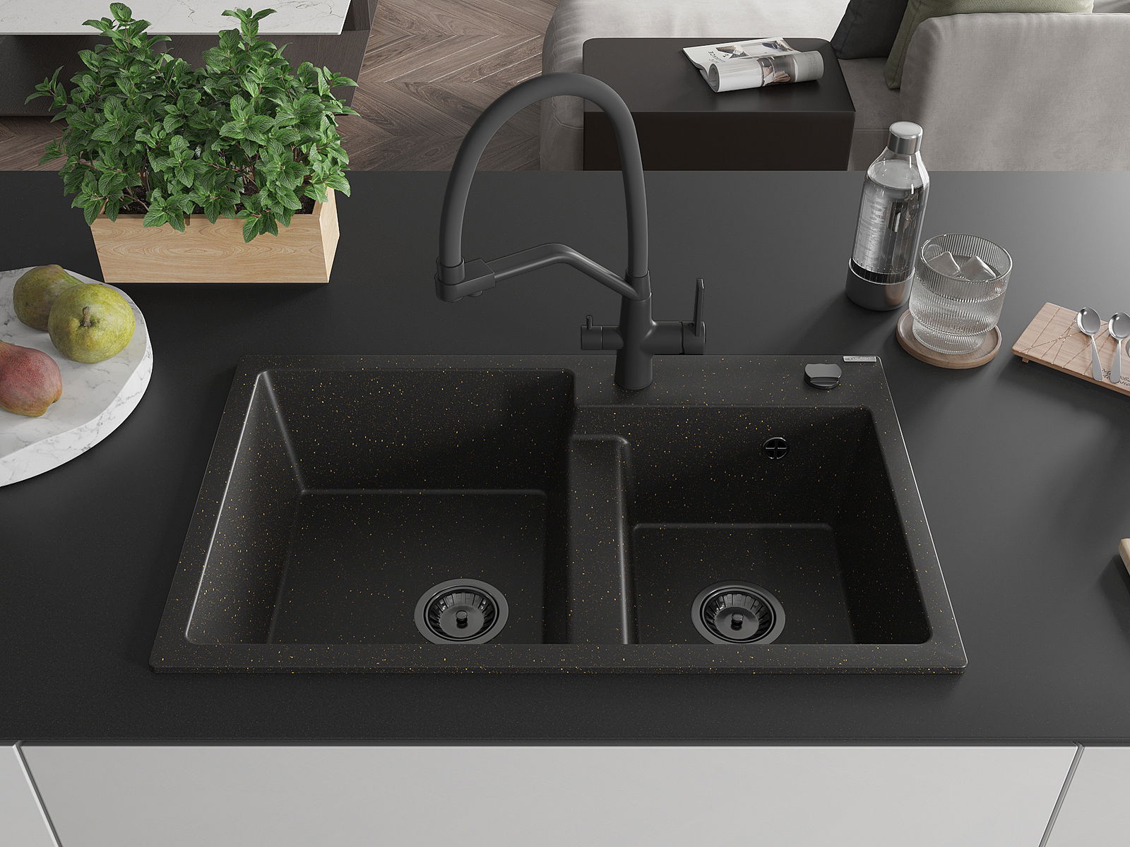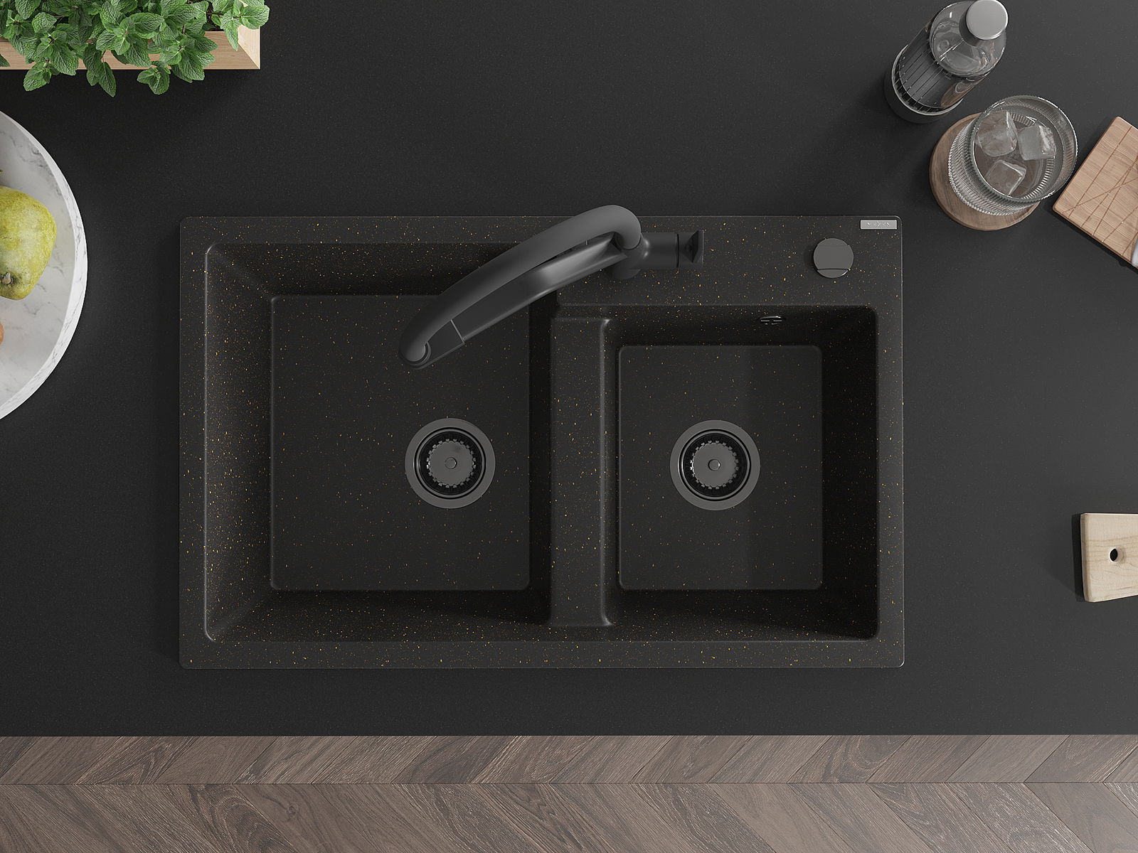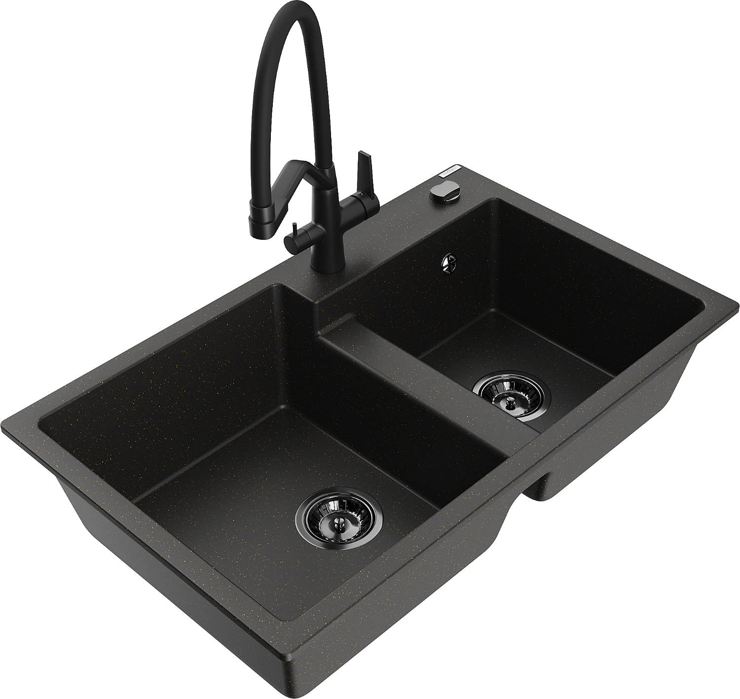Mexen Tomas двукоморна гранитна мивка с кухненски смесител Duo, черен/златен металик - 6516-75-671701-70-B