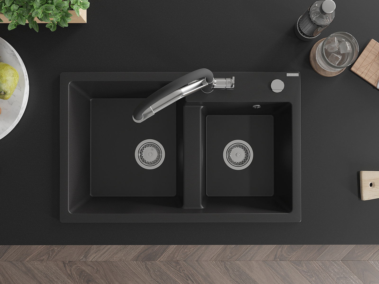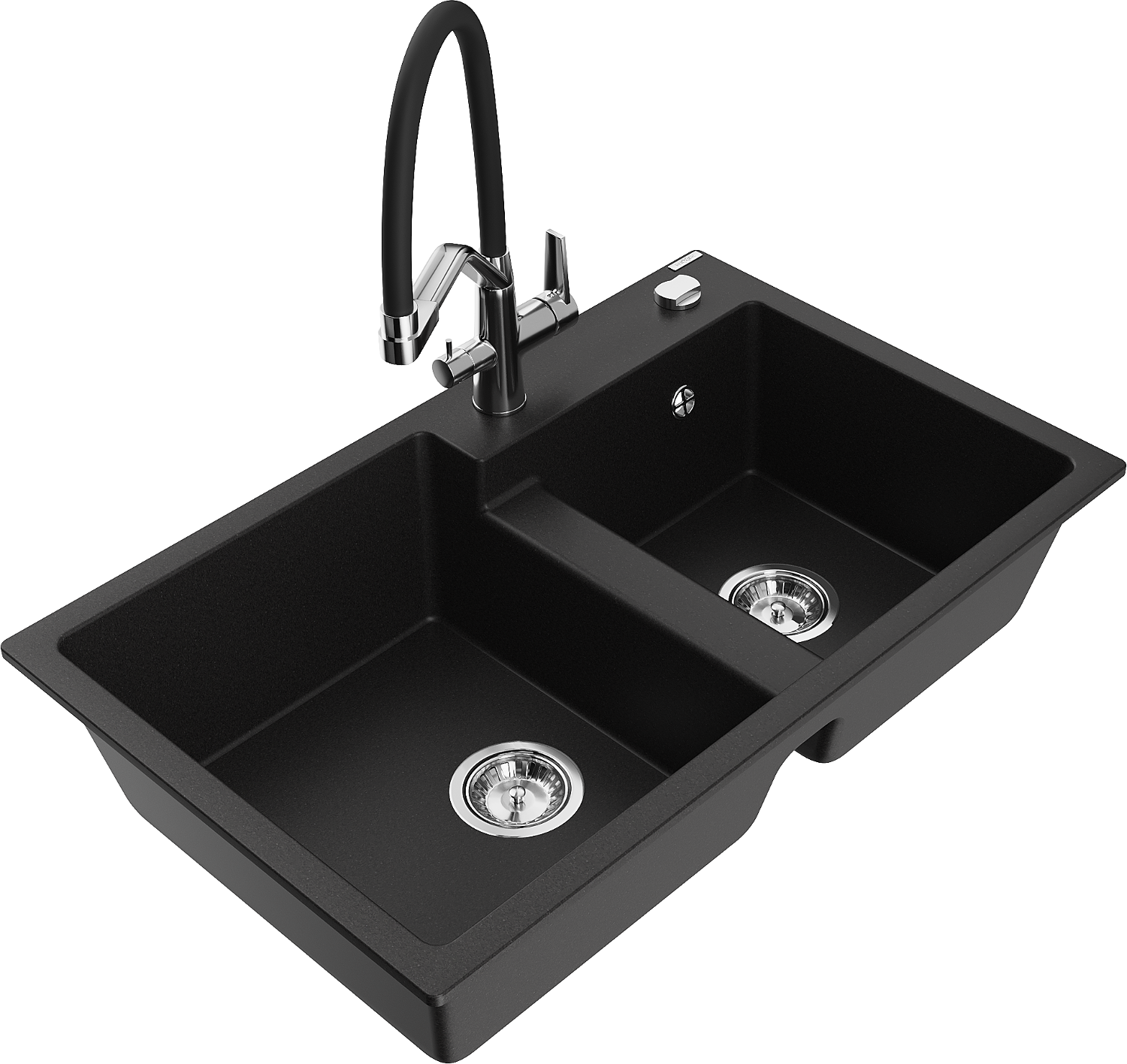 Mexen Tomas кухненска мивка от гранит с 2 камери и кухненски смесител Duo, черен - 6516-77-671701-07