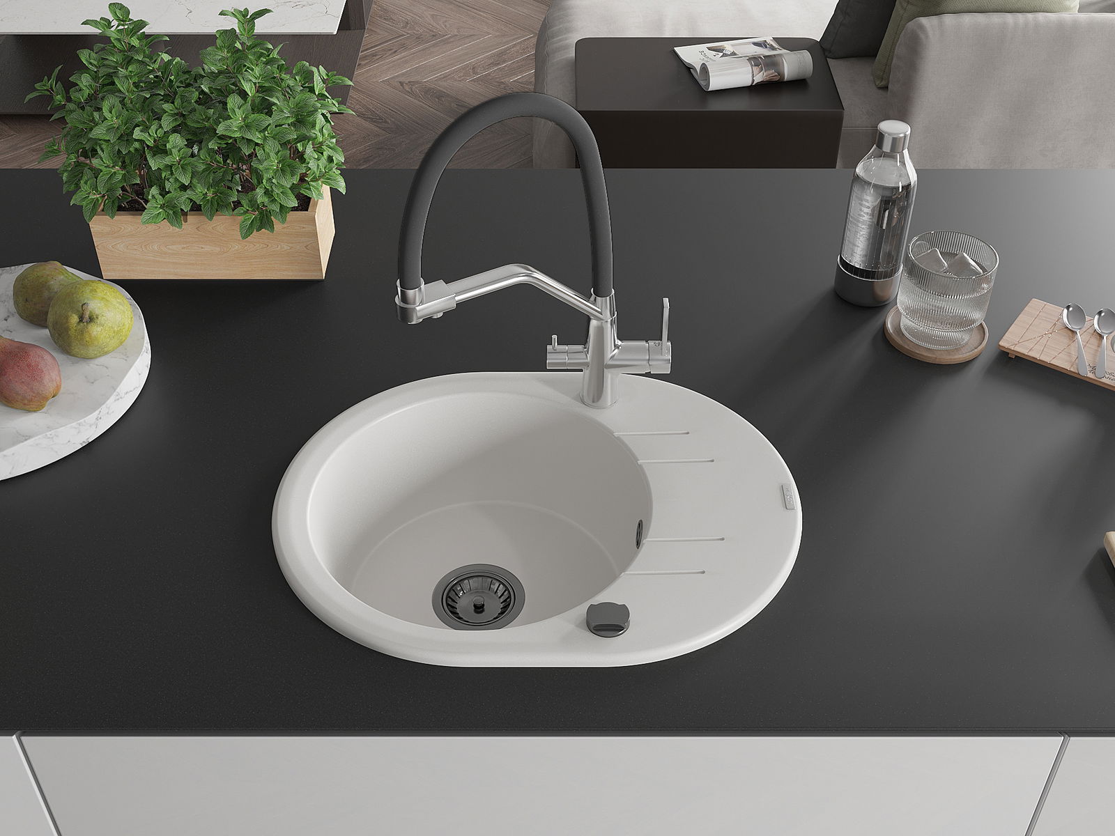 Мивката е направена от висококачествен гранит. Това е елегантно и най -вече практично допълнение към всяка кухня, независимо от нейния стил. Висококачествената и гранитна издръжливост осигуряват много години употреба.