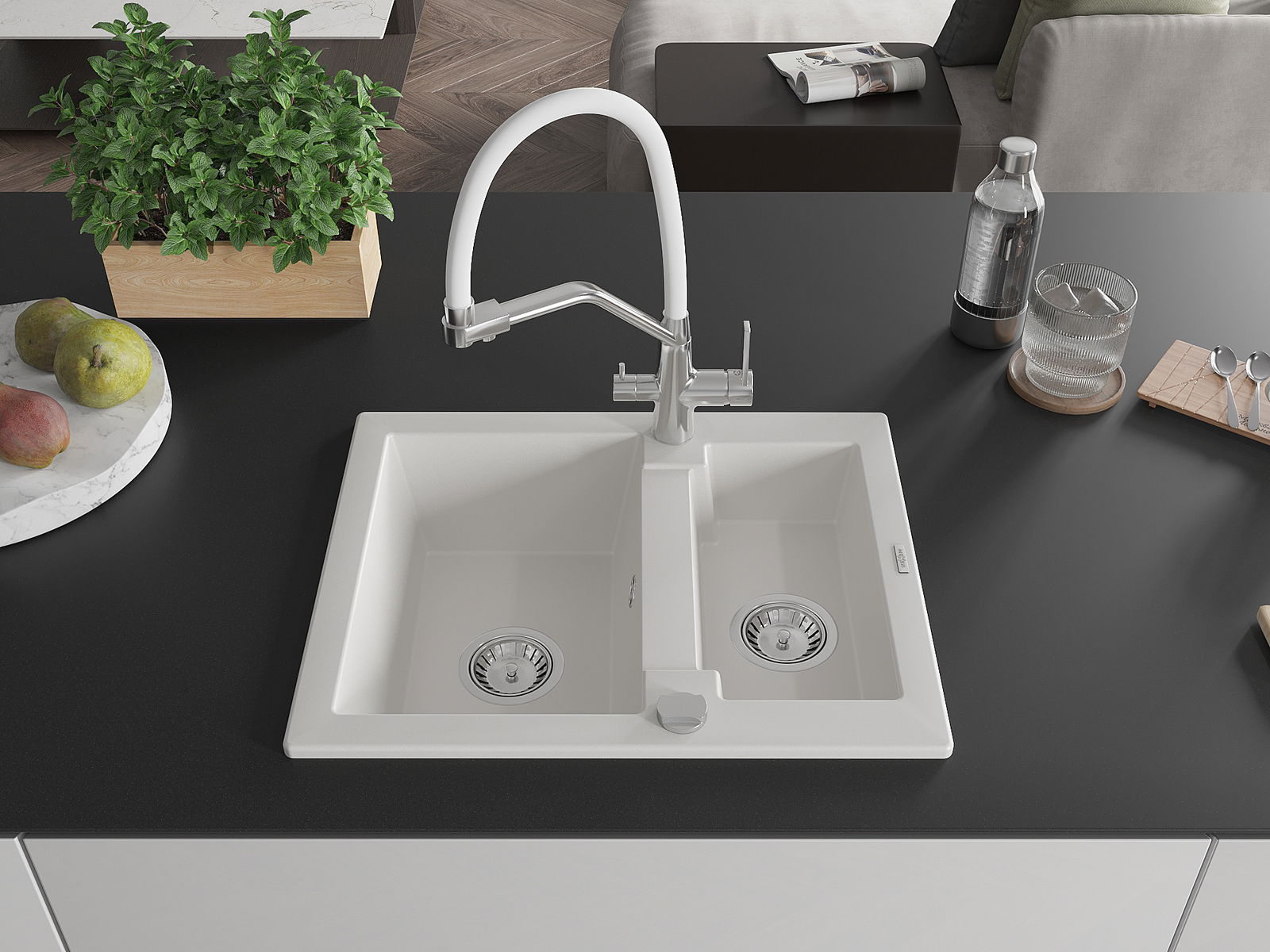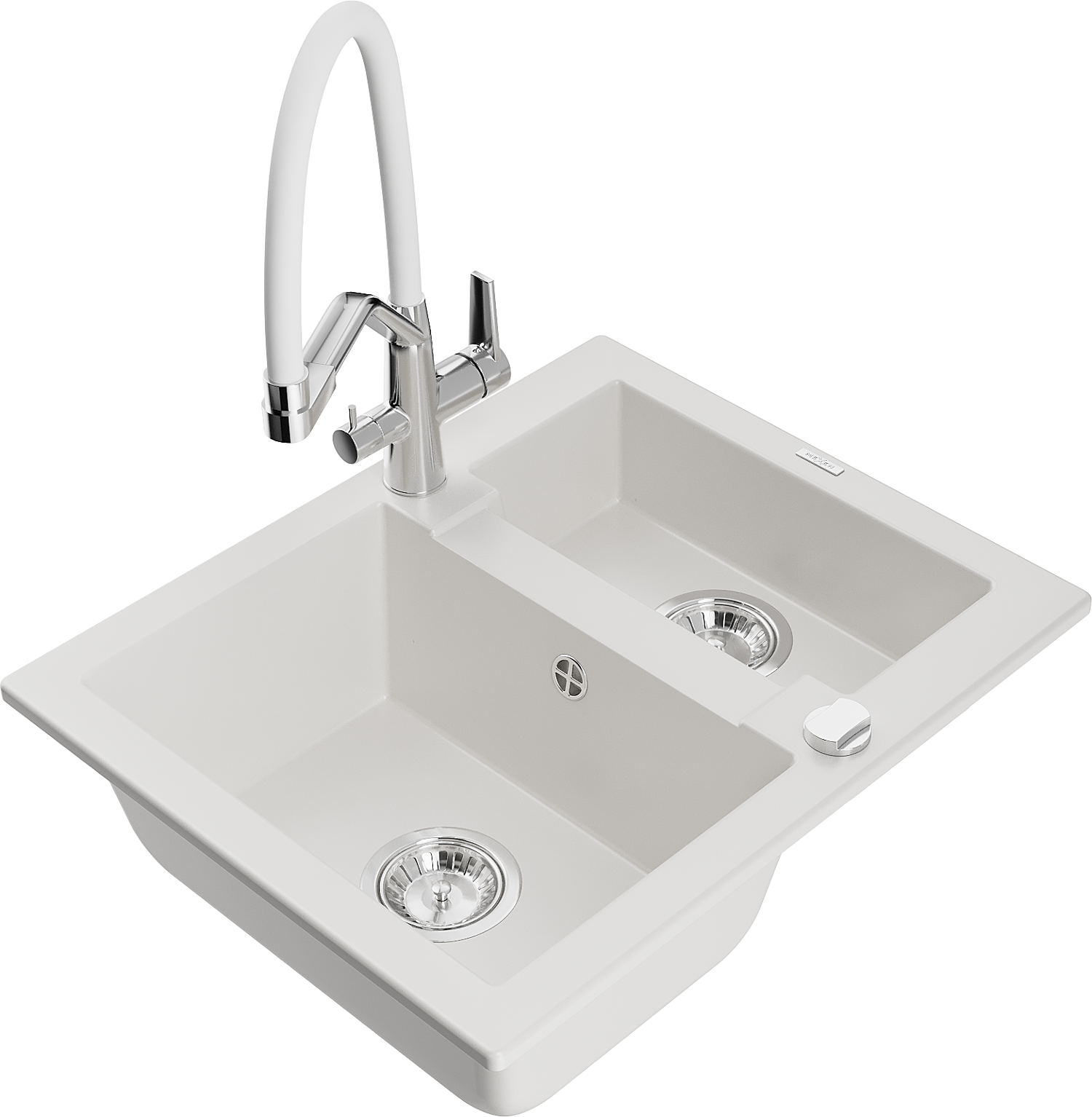 Mexen Carlos гранитна мивка с 1,5 отделения и кухненски смесител Duo, бял - 6518-20-671701-02