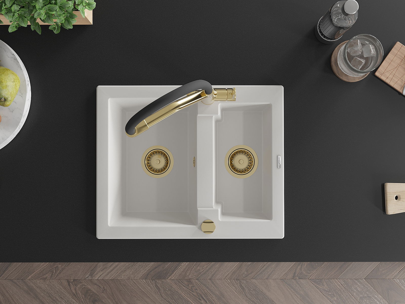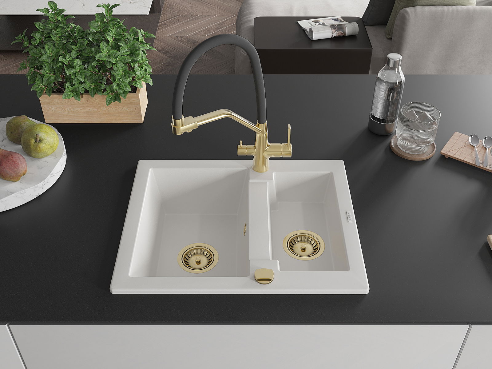 Mexen Carlos гранитна мивка 1,5-камерна с кухненски смесител Duo, бял - 6518-20-671701-57-G