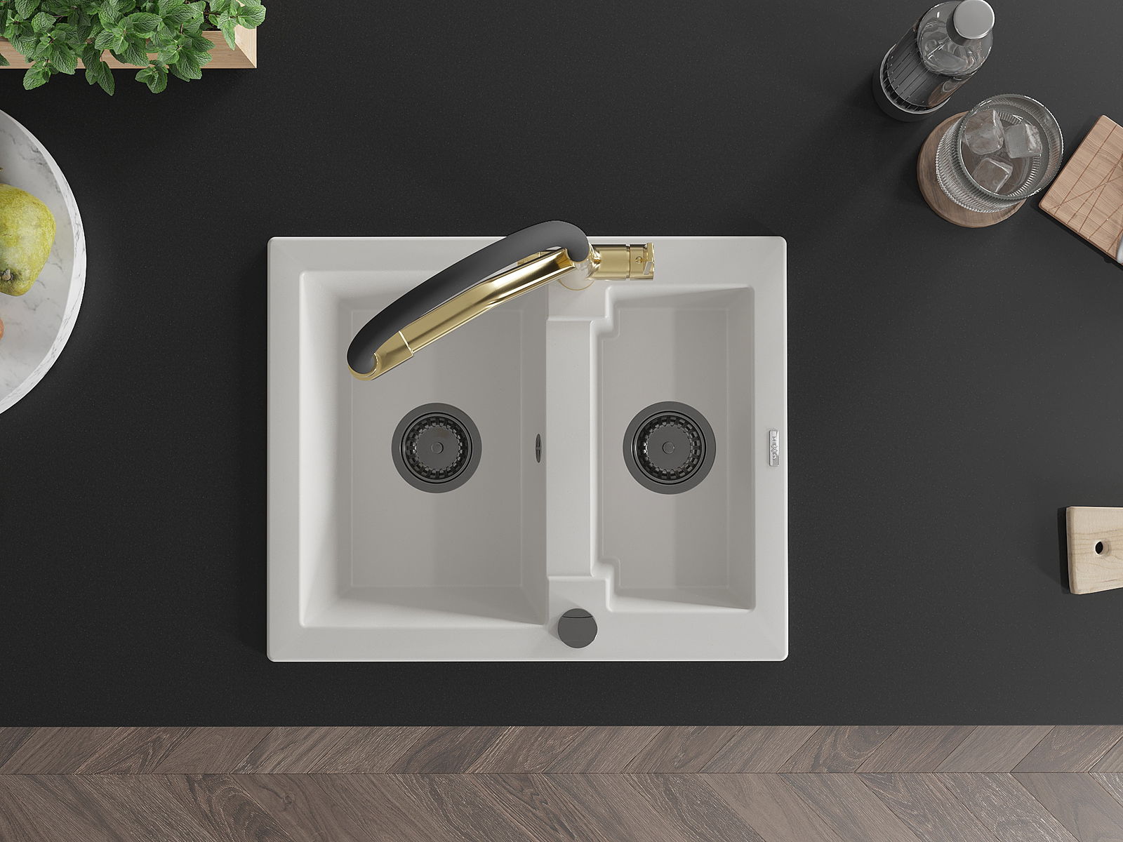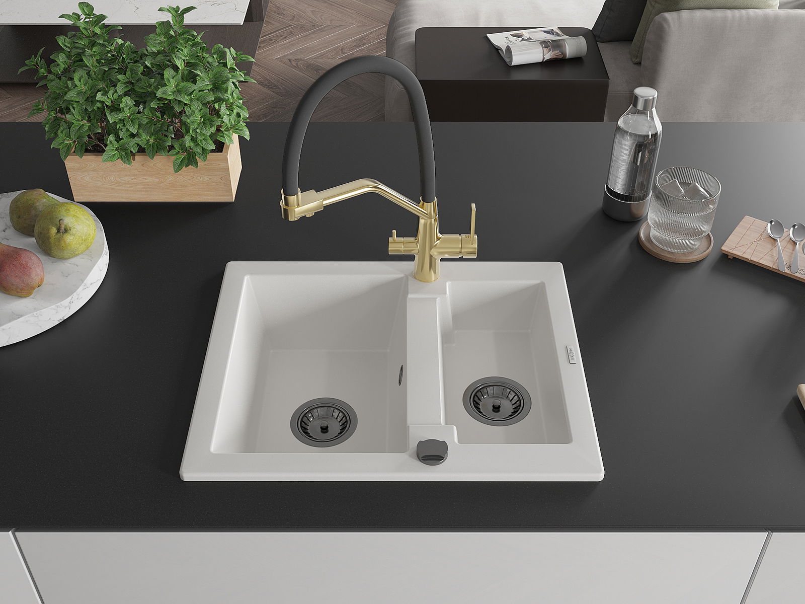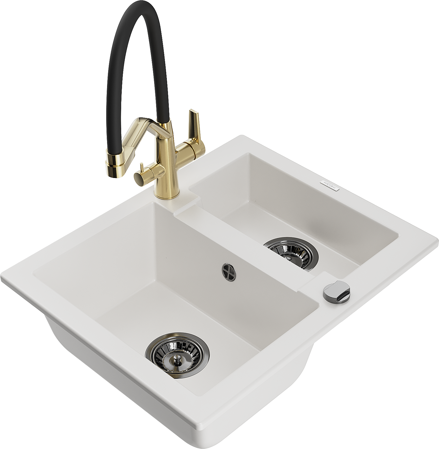 Mexen Carlos гранитна мивка 1,5-камерна с кухненски смесител Duo, бял - 6518-20-671701-57-B