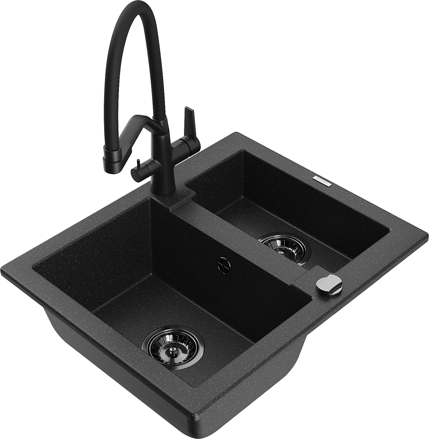 Mexen Carlos гранитна кухненска мивка 1,5-камерна с кухненски смесител Duo, черен/сребърен металик - 6518-73-671701-70-B