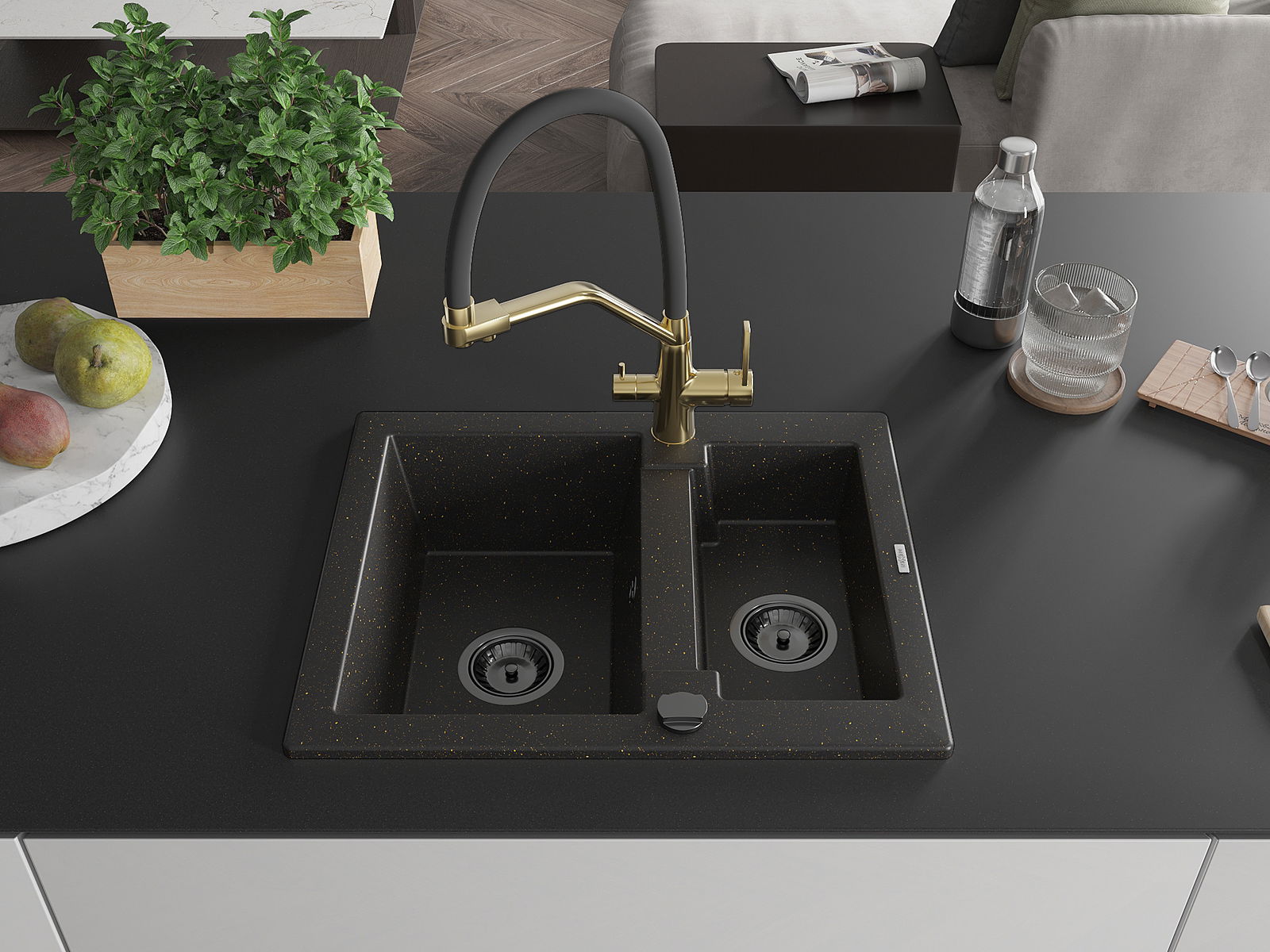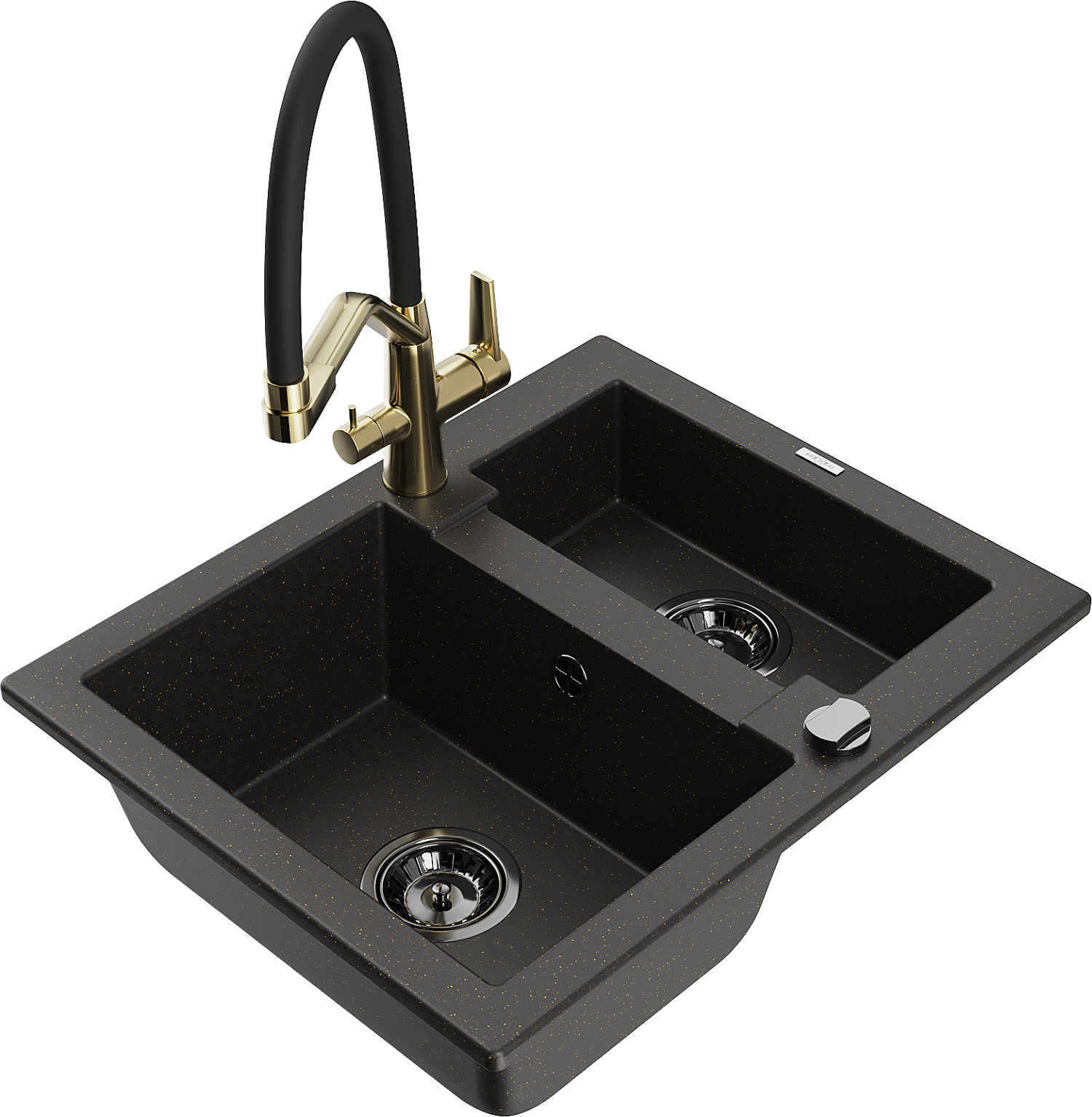 Mexen Carlos гранитна мивка 1,5-коморна с кухненски смесител Duo, черен/златен металик - 6518-75-671701-57-B