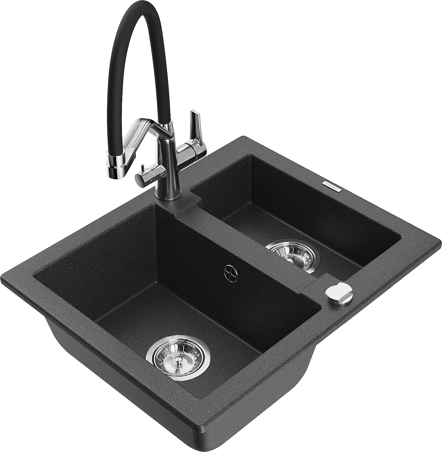 Mexen Carlos гранитна кухненска мивка с 1,5 камери и кухненски смесител Duo, черна на капки - 6518-76-671701-07