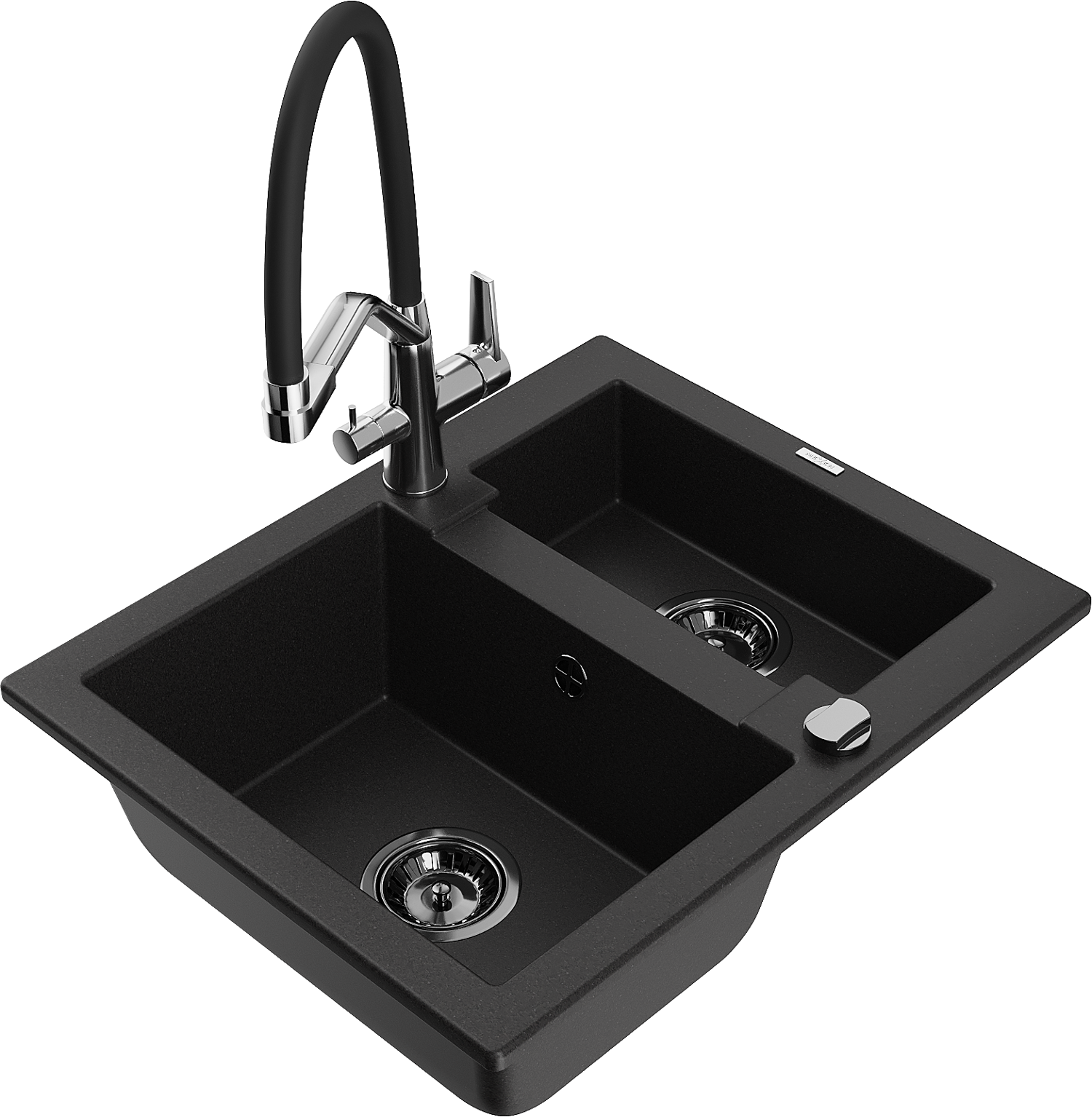 Mexen Carlos гранитна мивка 1,5-коморна с кухненски смесител Duo, черен - 6518-77-671701-07-B