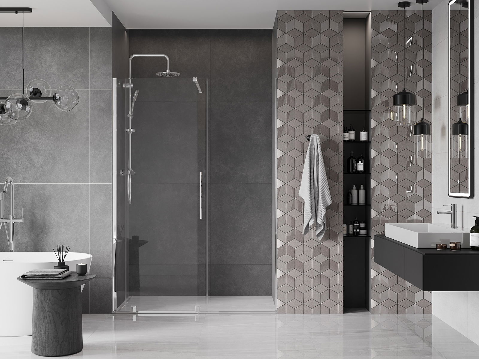 Практичната и удобна дръжка е изработена от неръждаема стомана. Модерната форма в комбинация с покритие, съчетано с цвета на профилите, придава на цялото съвременен и стилен вид, подчертавайки естетиката на всяка баня.
