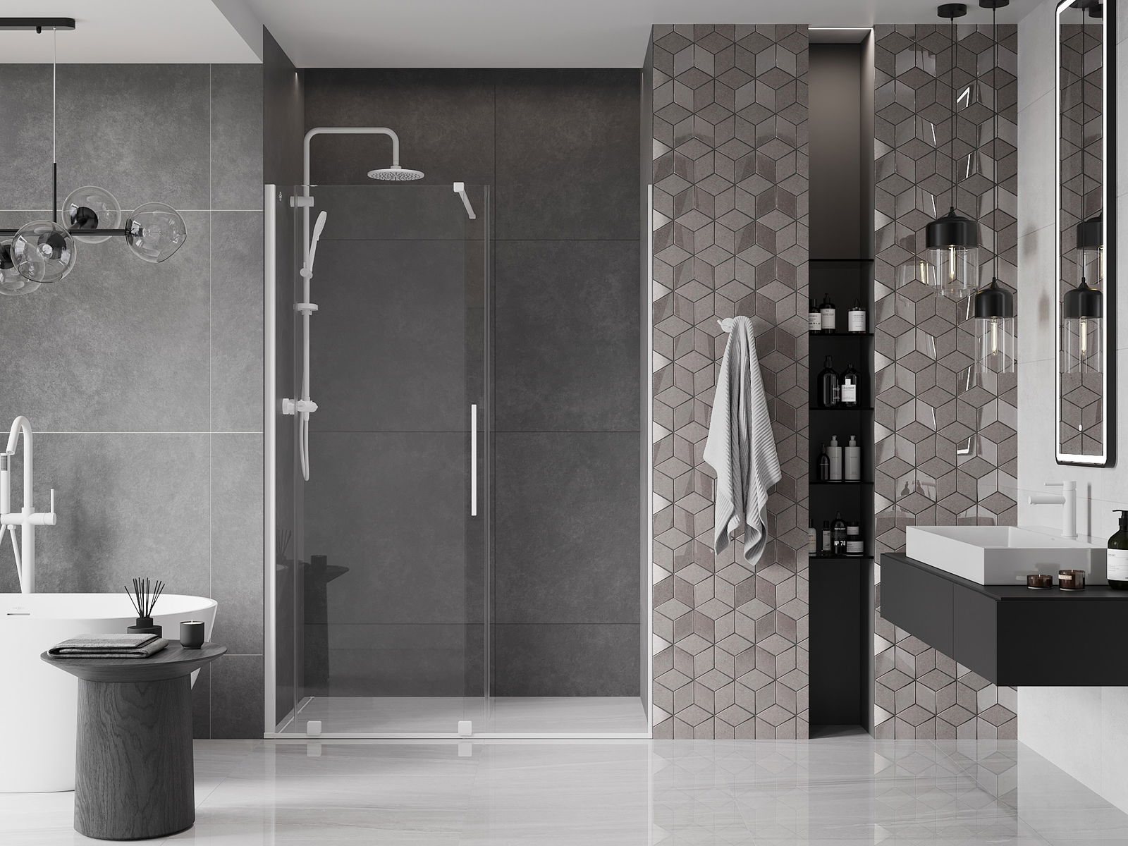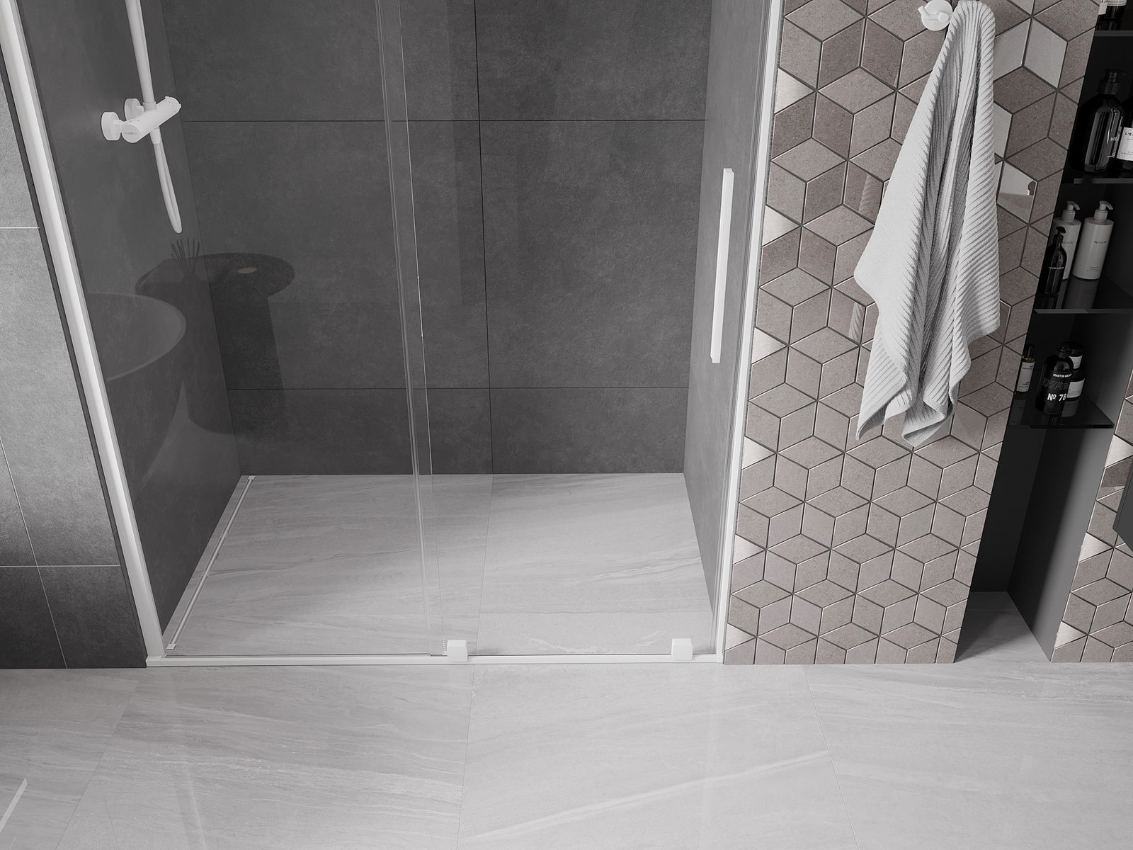 Практичната и удобна дръжка е изработена от неръждаема стомана. Модерната форма в комбинация с покритие, съчетано с цвета на профилите, придава на цялото съвременен и стилен вид, подчертавайки естетиката на всяка баня.