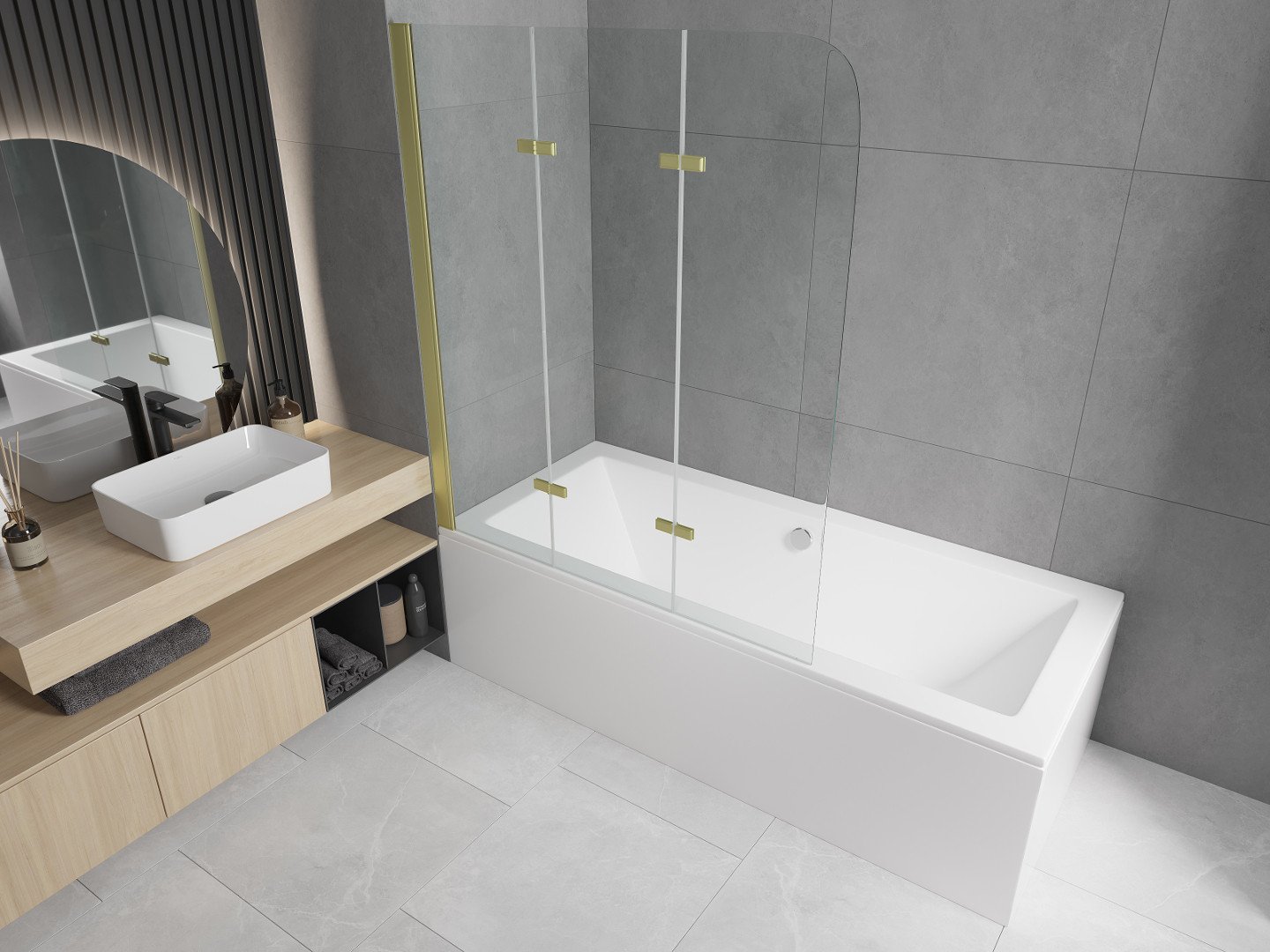 Екранът е направен от три крила с възможност за сгъване. Това решение спестява повече място в банята и ви позволява свободно да използвате останалото пространство, когато не използваме зоната за къпане.