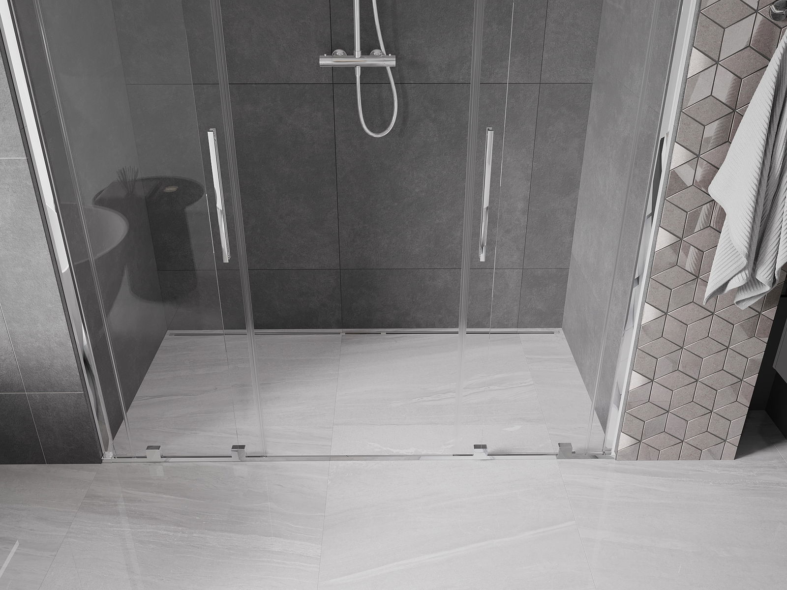 Удобната и комфортна дръжка е изработена от неръждаема стомана. Модерната форма, съчетана с покритие, което съответства на цвета на профилите, придава на цялото изделие модерен и стилен вид, подобряващ естетиката на всяка баня.