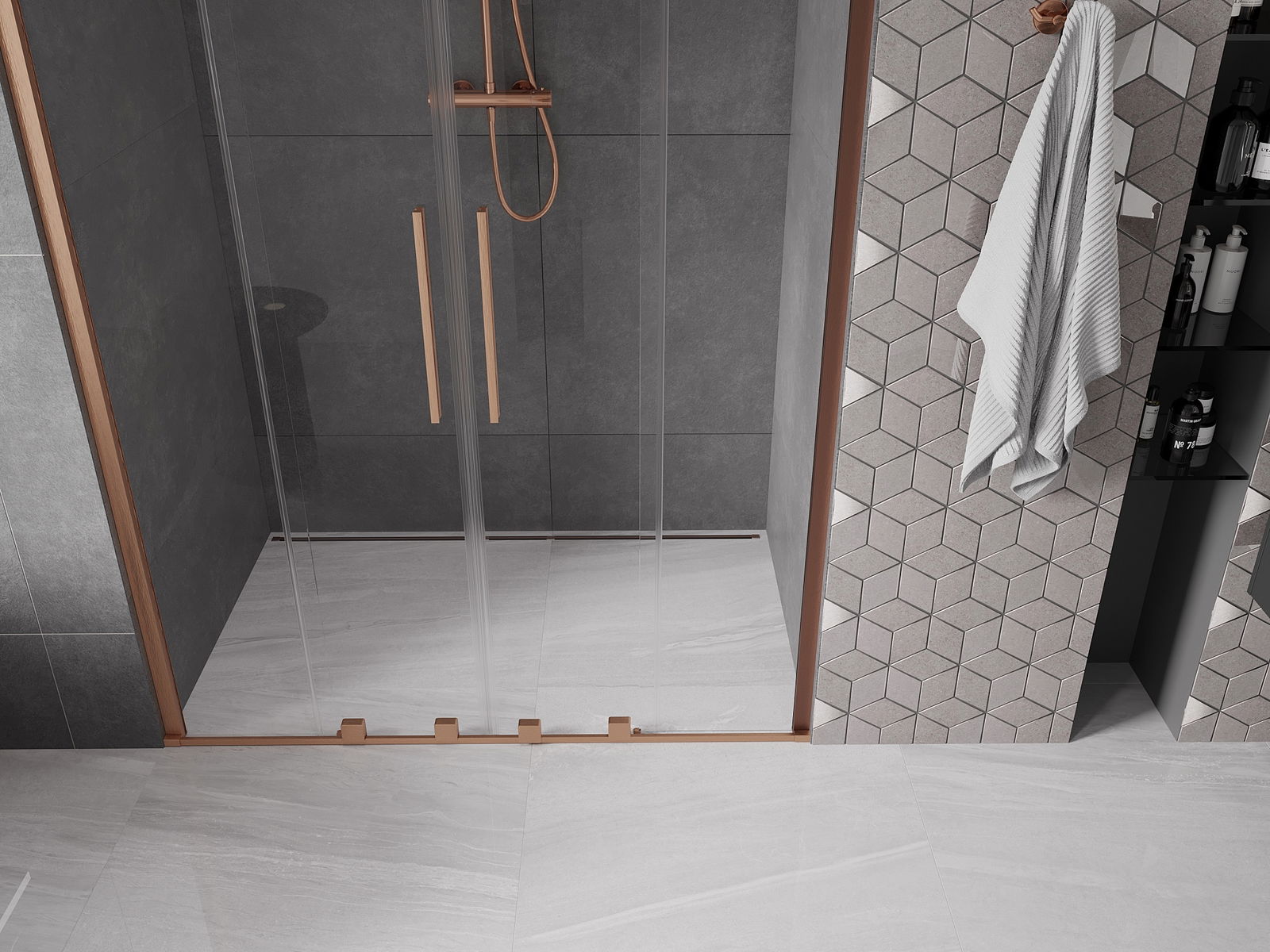 Удобната и комфортна дръжка е изработена от неръждаема стомана. Модерната форма, съчетана с покритие, което съответства на цвета на профилите, придава на цялото изделие модерен и стилен вид, подобряващ естетиката на всяка баня.